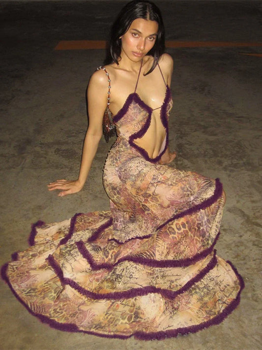 Frilly Halter Backless Split Long Dresses for Women Y2k 2000s Aesthetic Print Maxi Dress Sexy Party Outfits