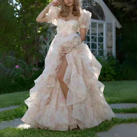 qgtao Long Floral Print Prom Dresses for Women Square-Neck Floor-Length A-Line Special Event Wedding Gala Evening Party Maxi New