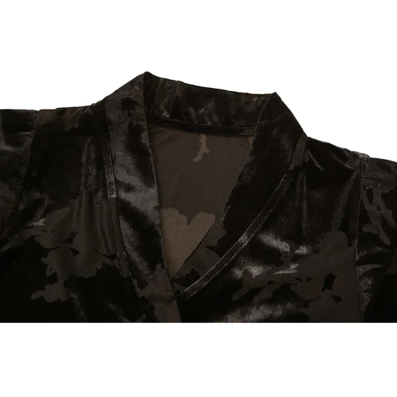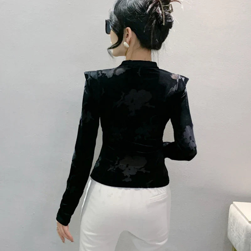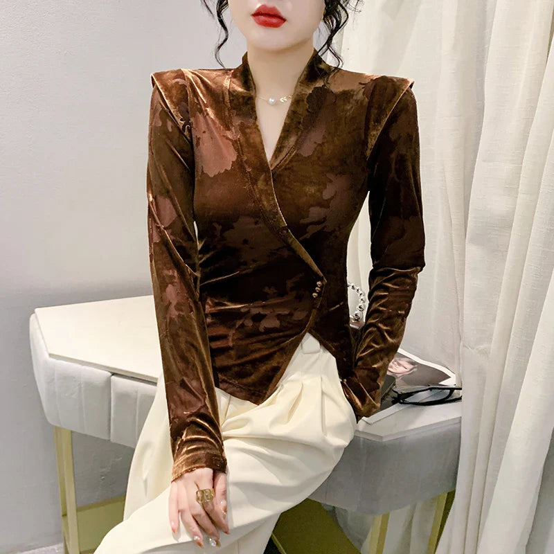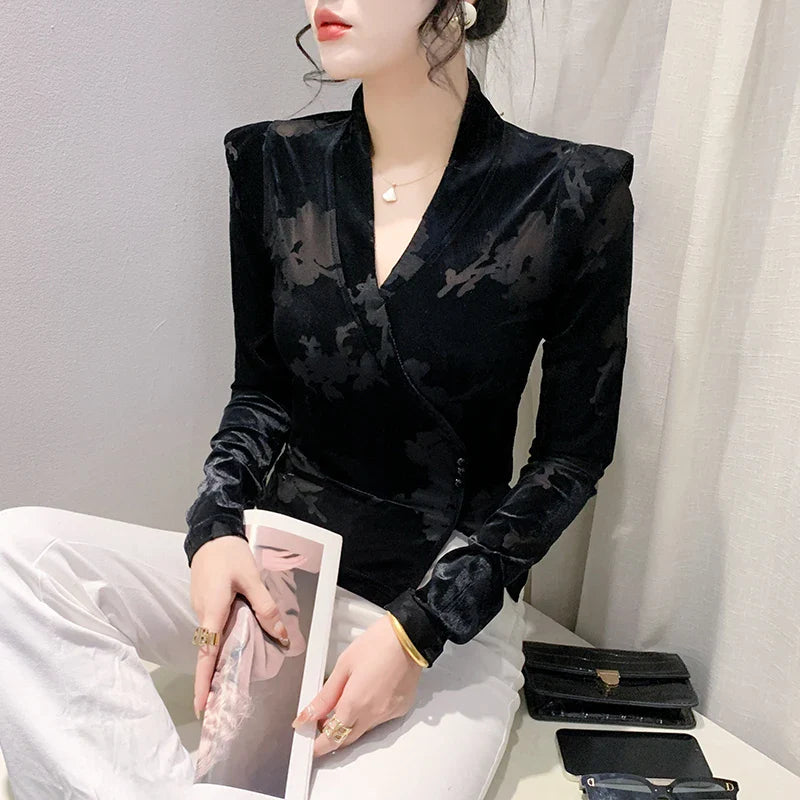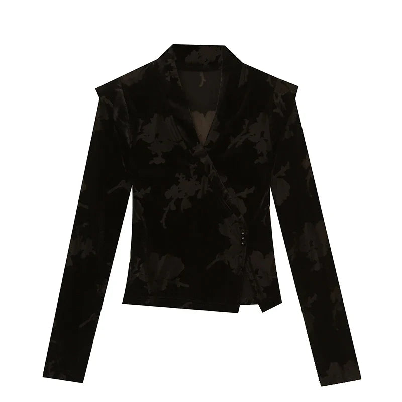 2024 New Spring Summer European Clothes Velvet T-Shirt Irregular V-Neck Sexy Women Tops Long Sleeve Plants Flowers Tees 42029