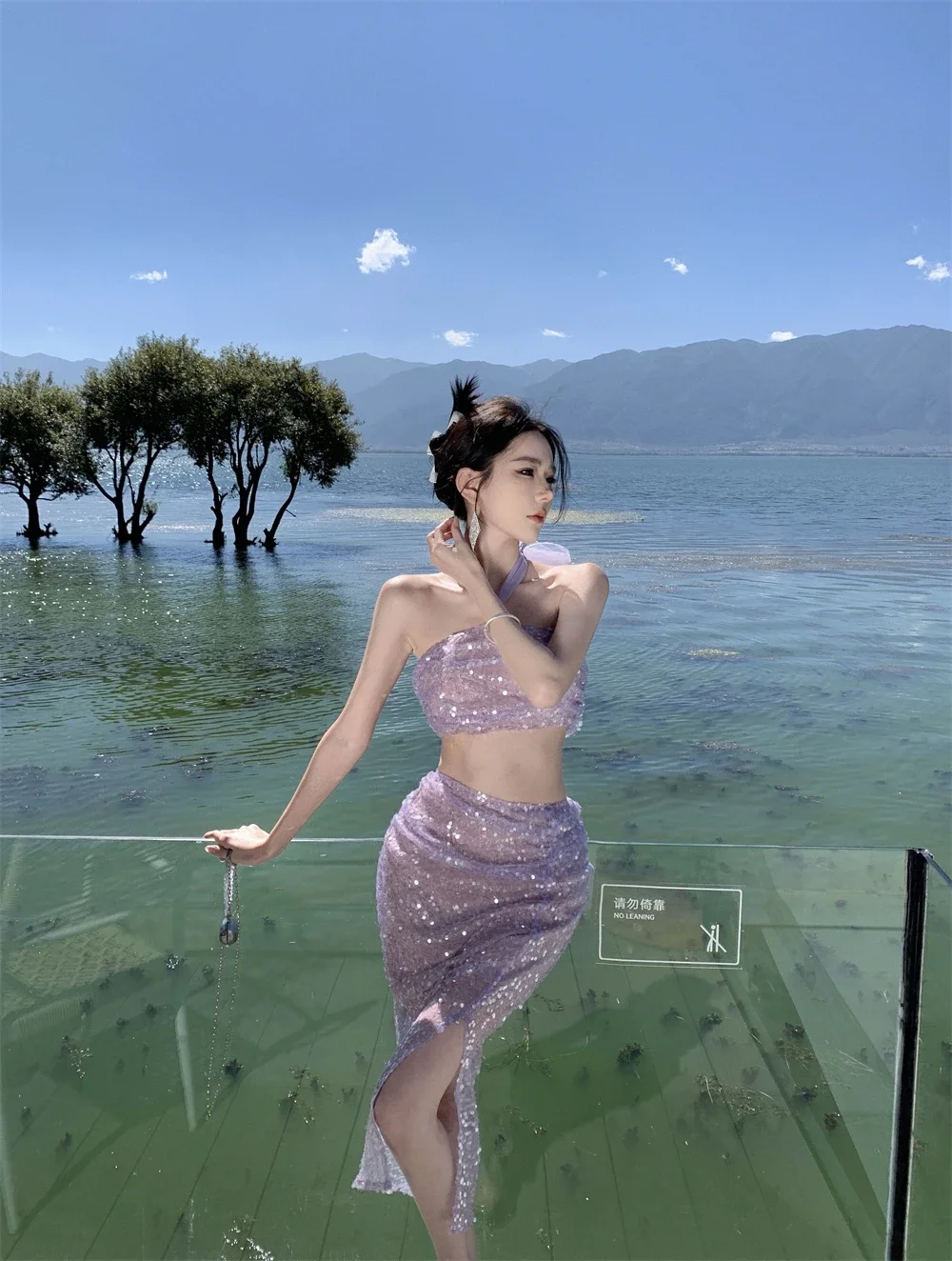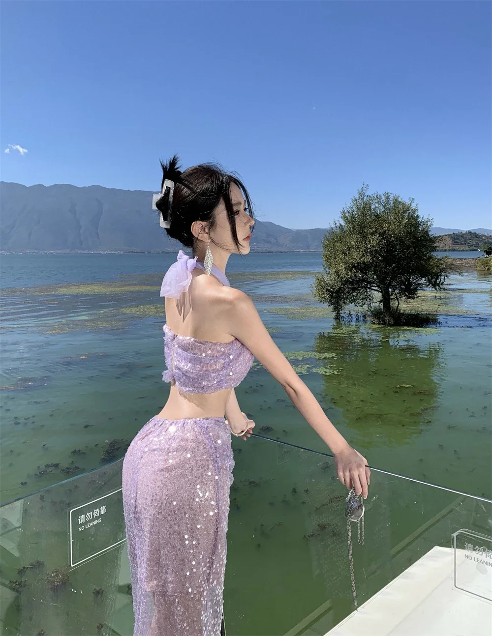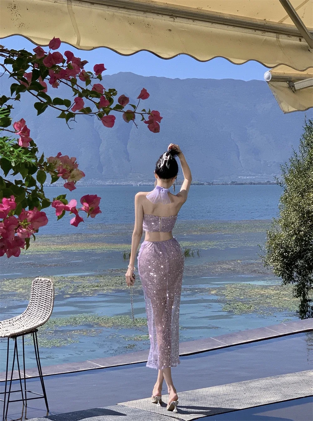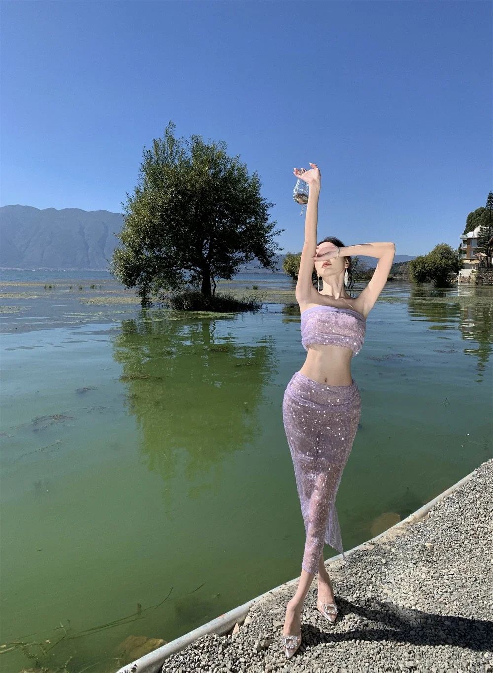 qgtao-2024 New Summer Purple Sequin Set for Women Sexy Split Half-body Dress Beach Holiday Casual Elegant 2 Pieces Female Clothing