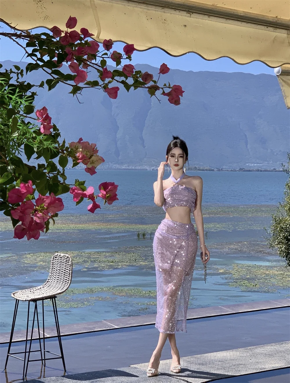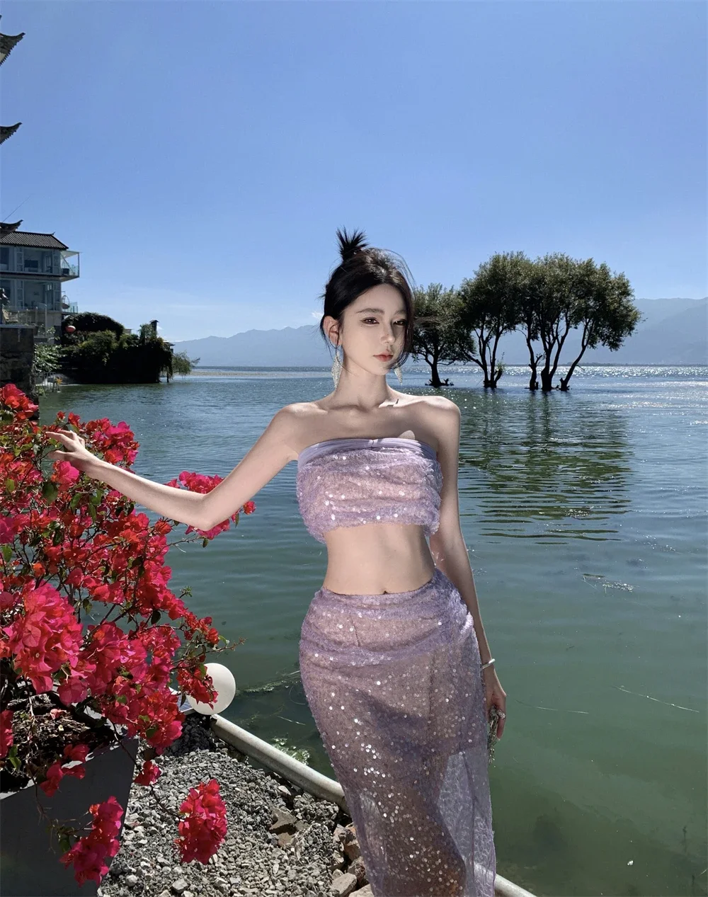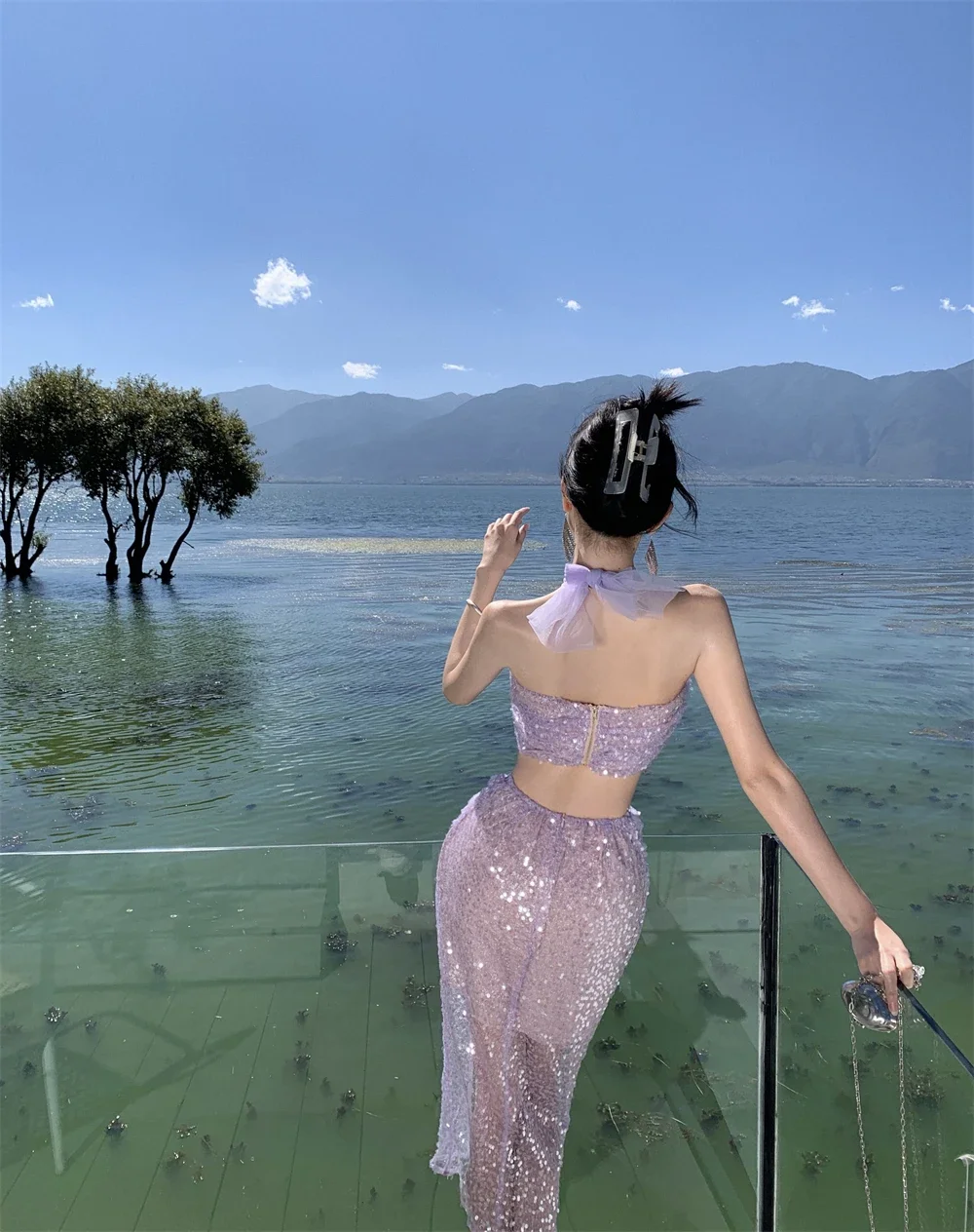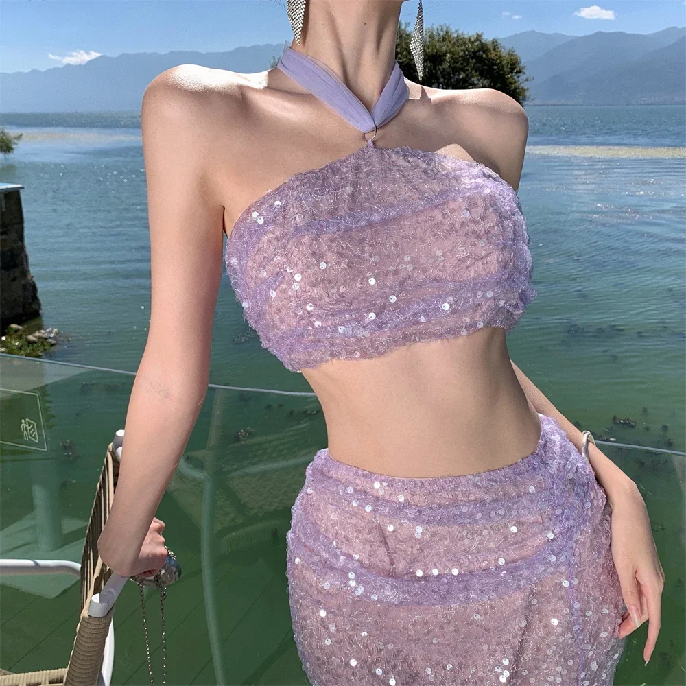qgtao-2024 New Summer Purple Sequin Set for Women Sexy Split Half-body Dress Beach Holiday Casual Elegant 2 Pieces Female Clothing