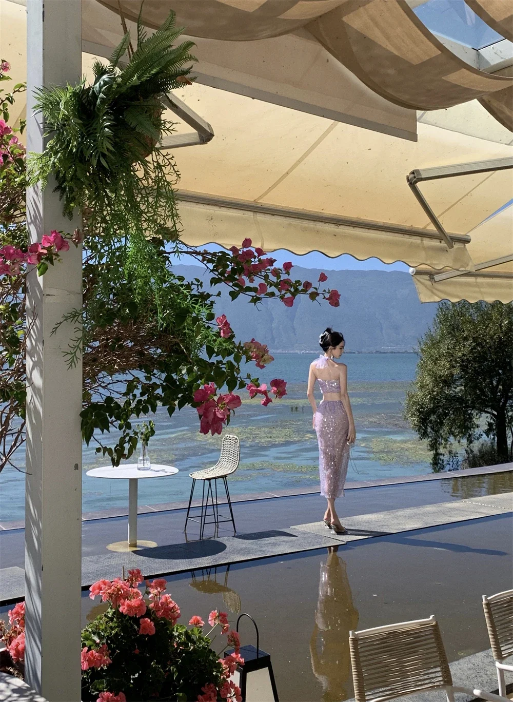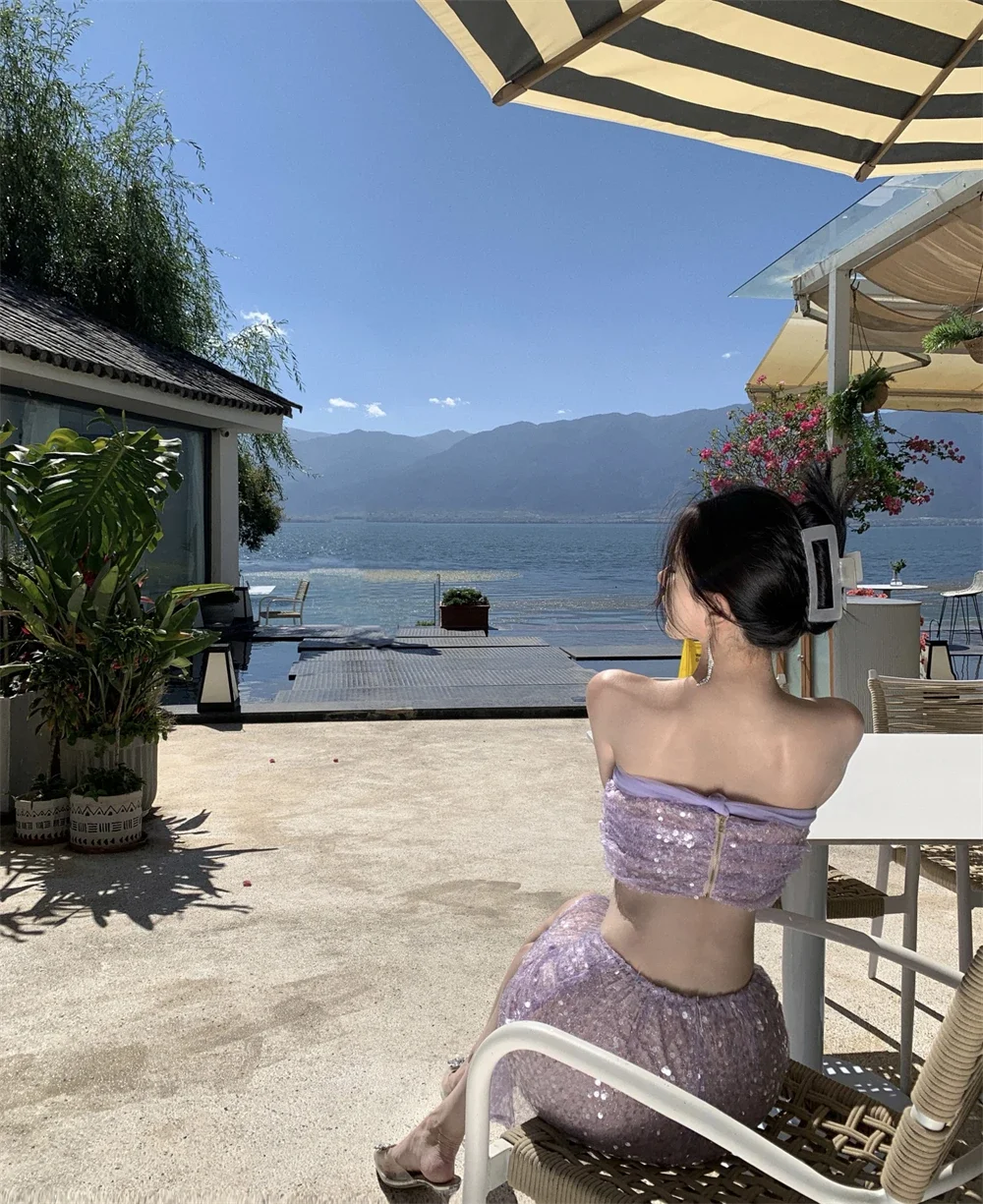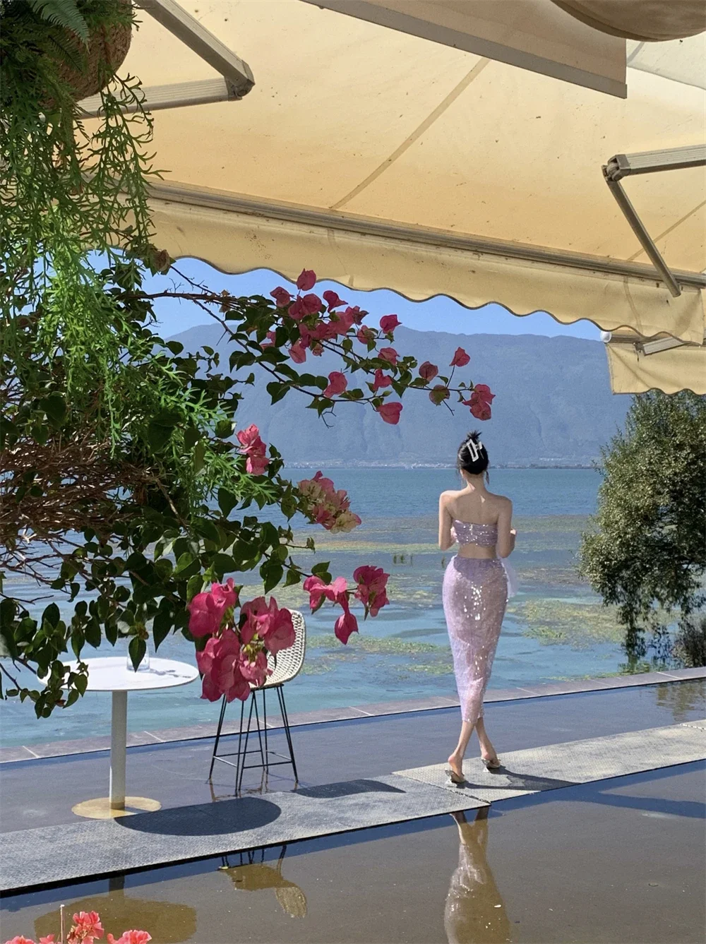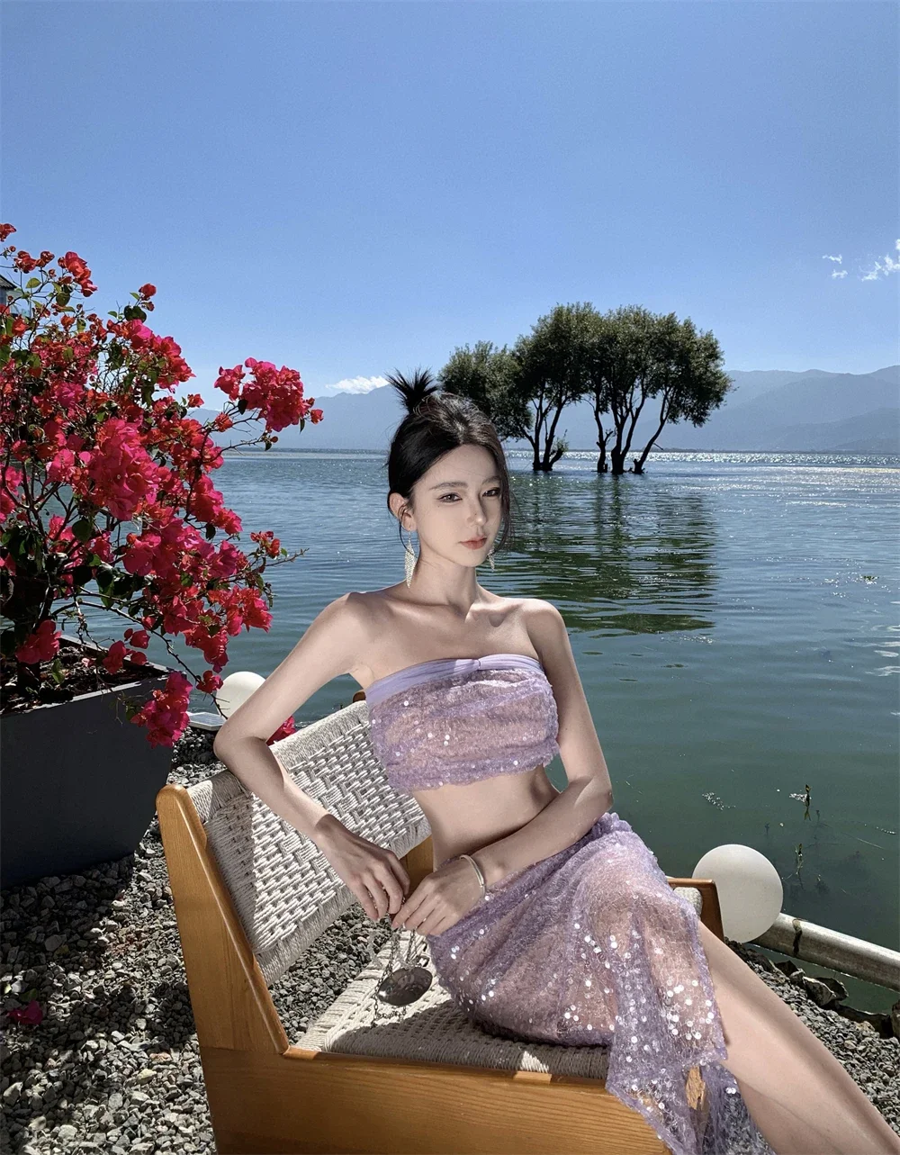 qgtao-2024 New Summer Purple Sequin Set for Women Sexy Split Half-body Dress Beach Holiday Casual Elegant 2 Pieces Female Clothing