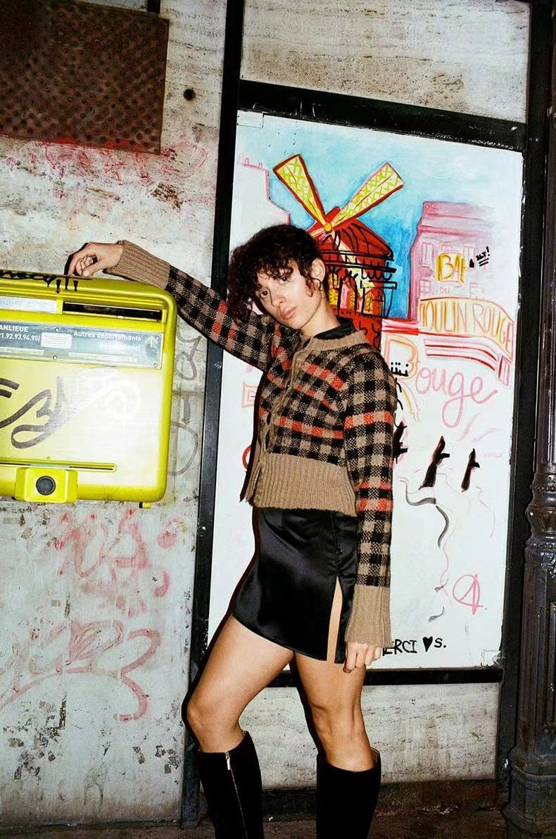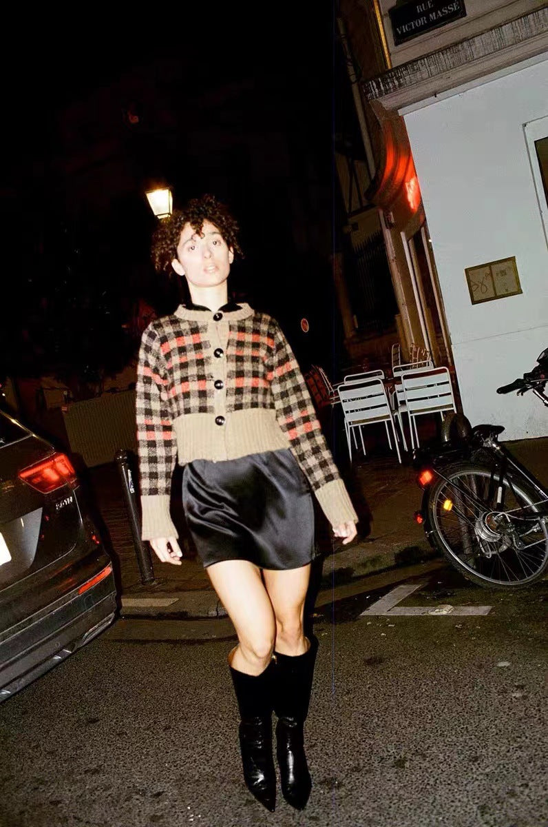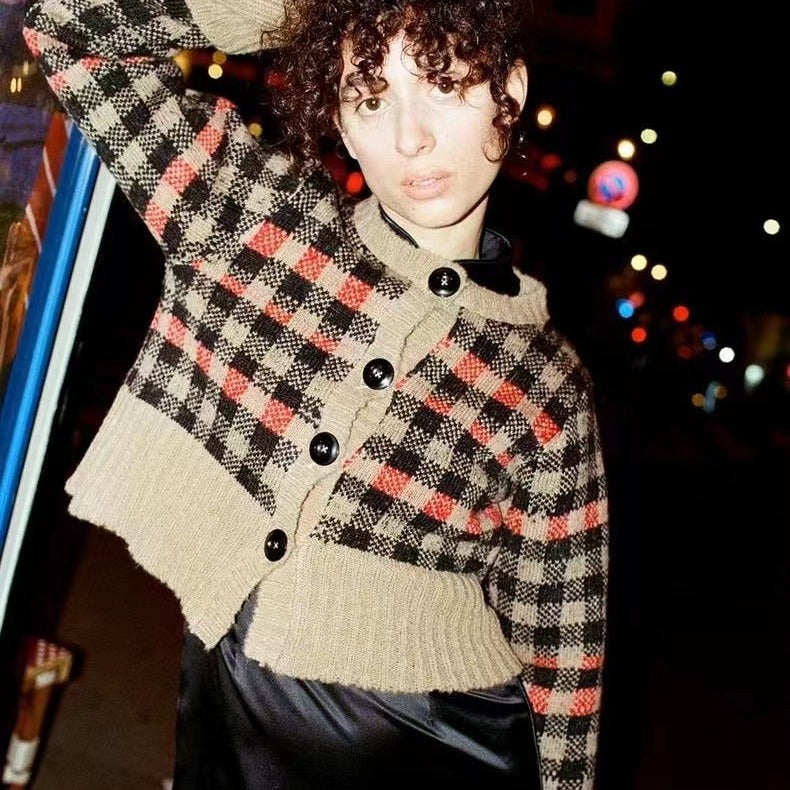 2025 24 autumn and winter new cardigan jacket women's top wool-blend long-sleeved round neck plaid knitted jacket women 31533