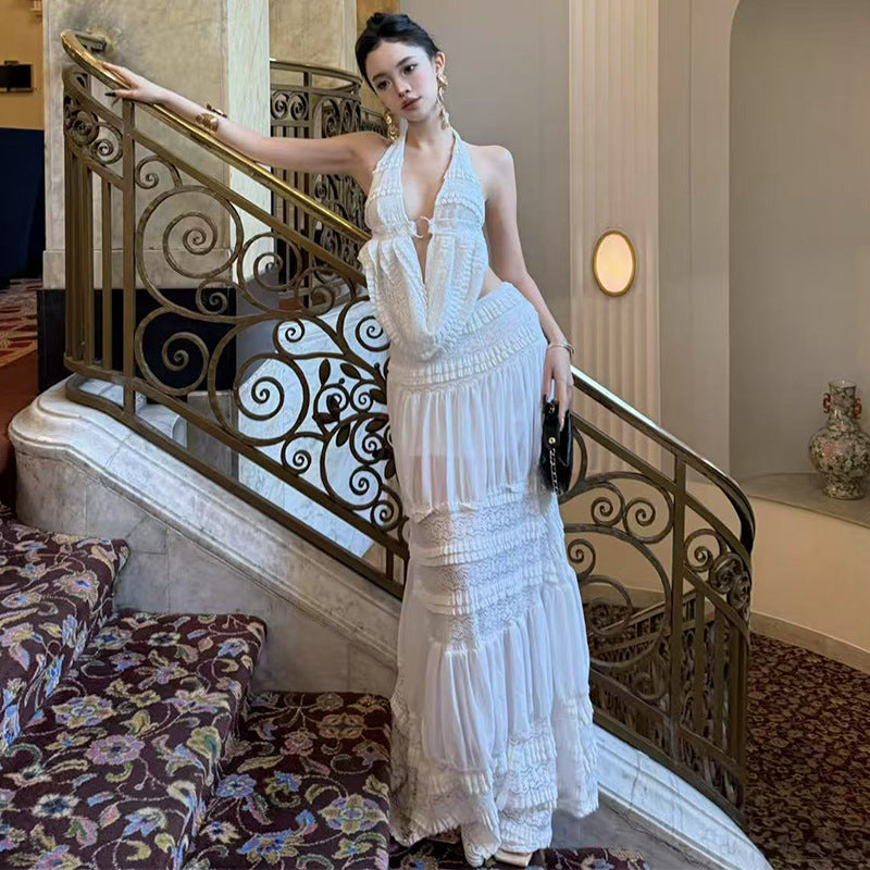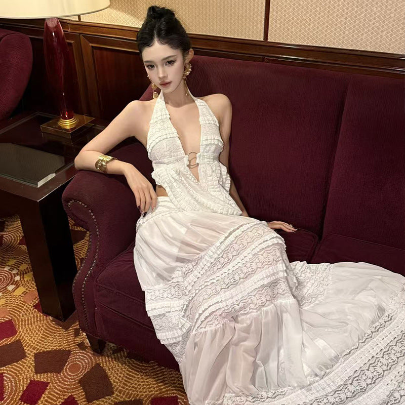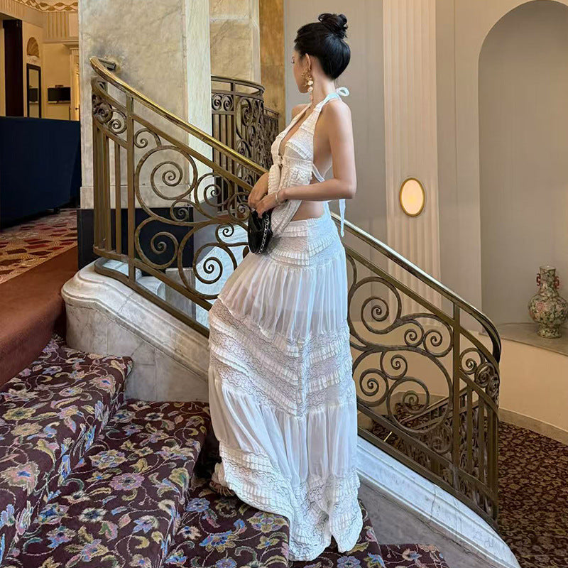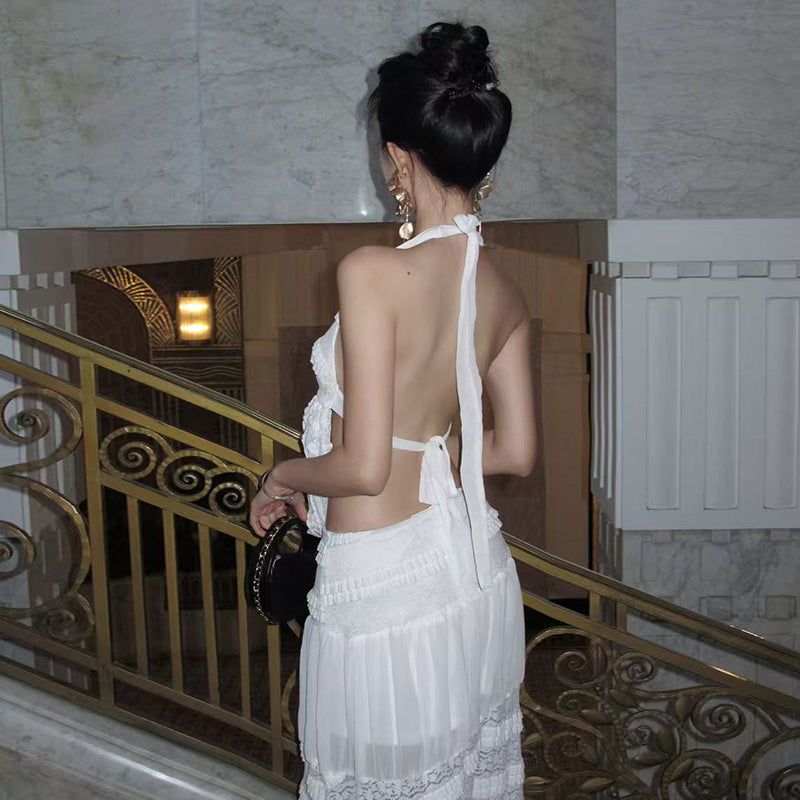 2025 Pure desire sexy seaside vacation style suit women's V-neck strap backless suspender mesh slightly transparent skirt two-piece set