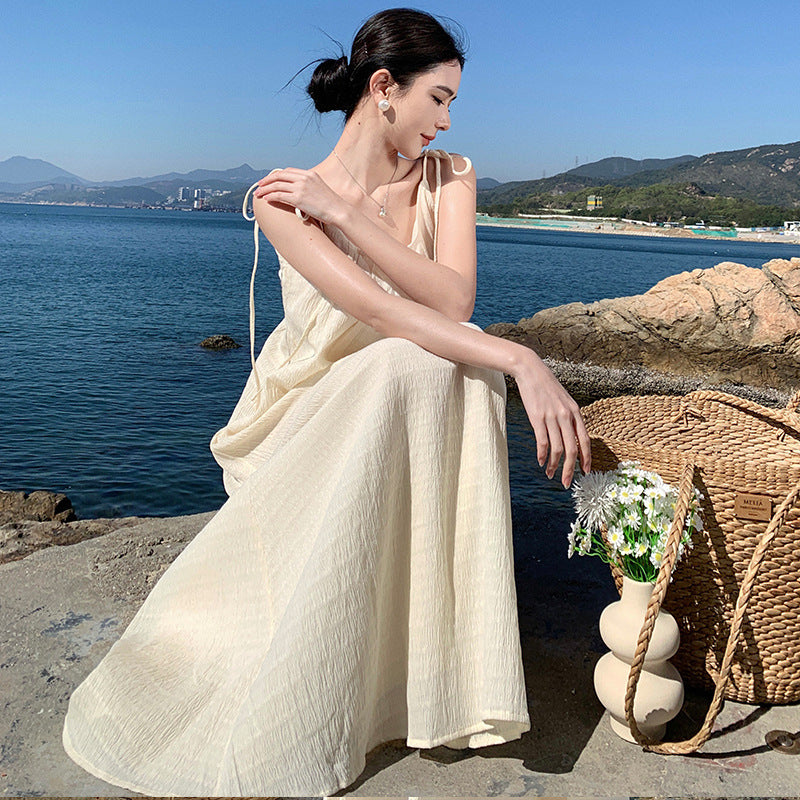 2025 Super good-looking casual vacation suspender dress women's summer temperament texture dark pattern loose backless long skirt