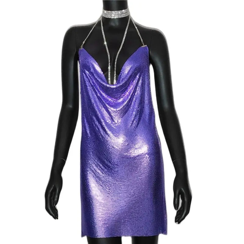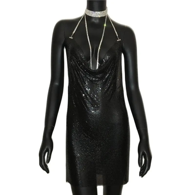 AKYZO Sexy Gold Sequined Patchwork Mini Dress Women Sleeveless Low Cut Metal Chains Halter Slim Charming Nightclub Party Dresses