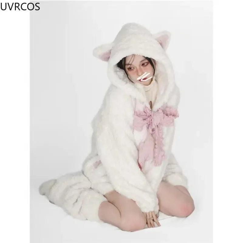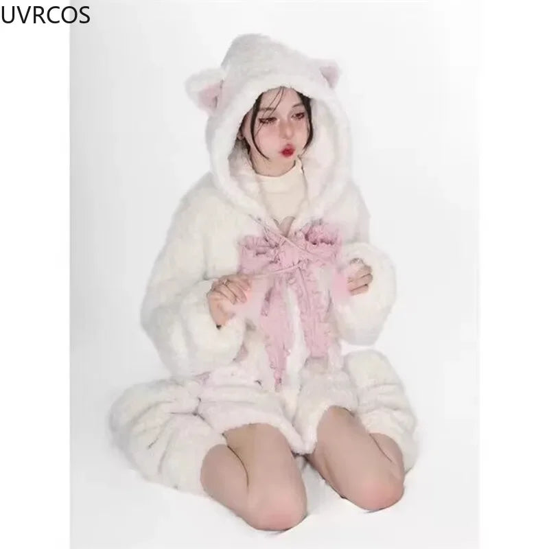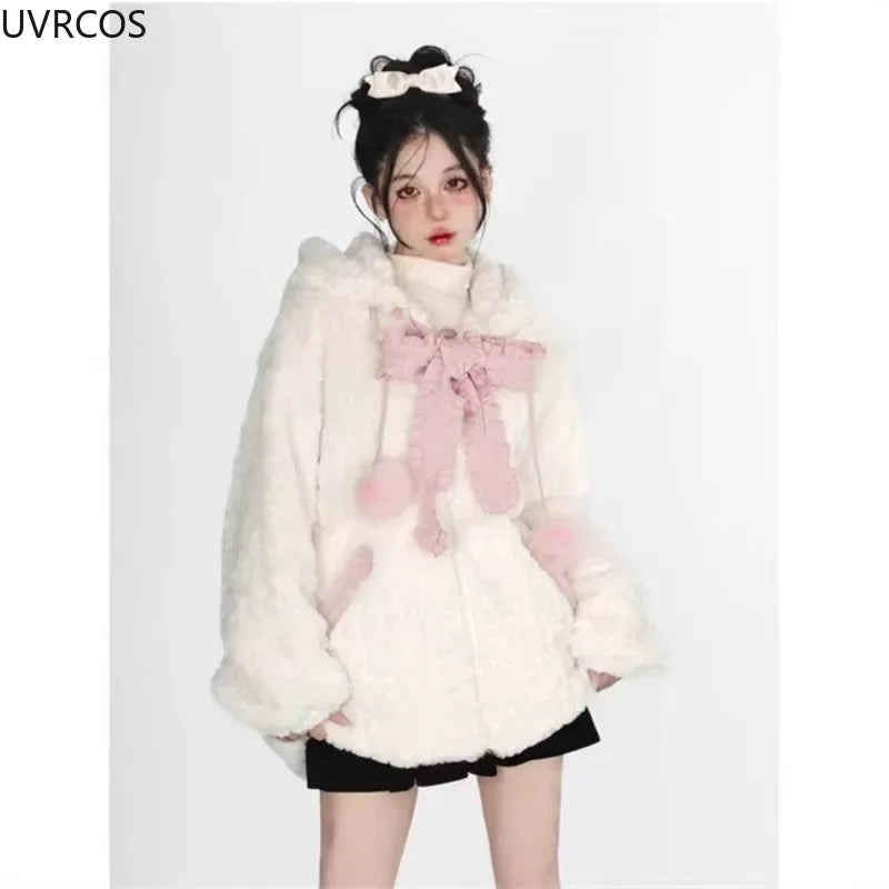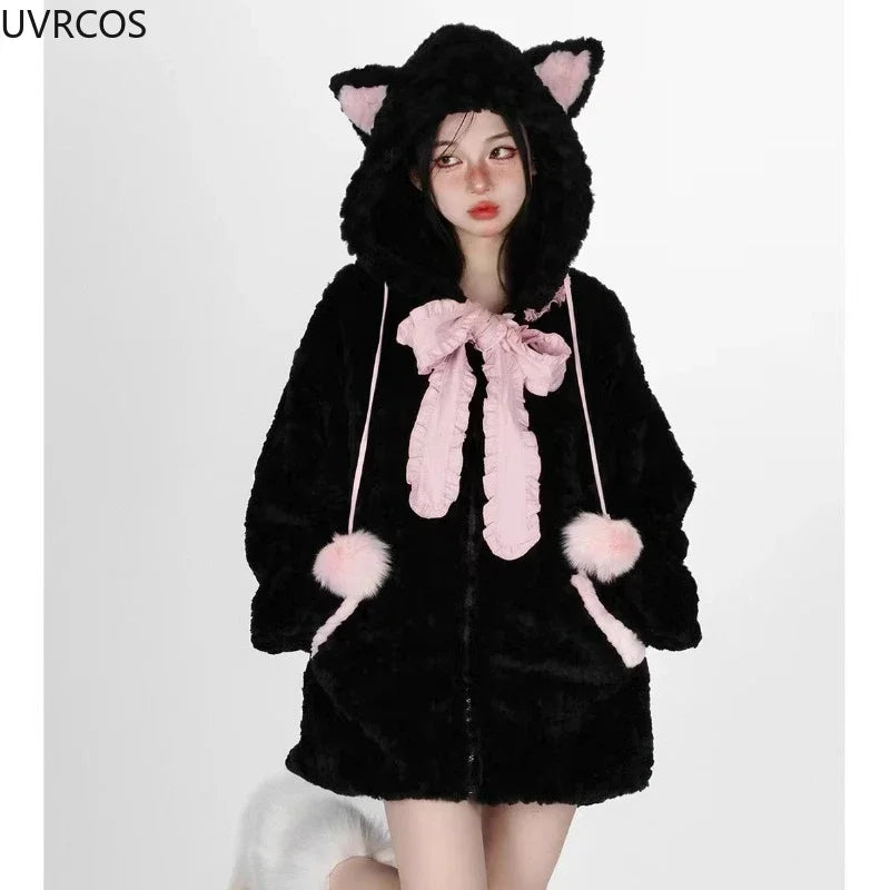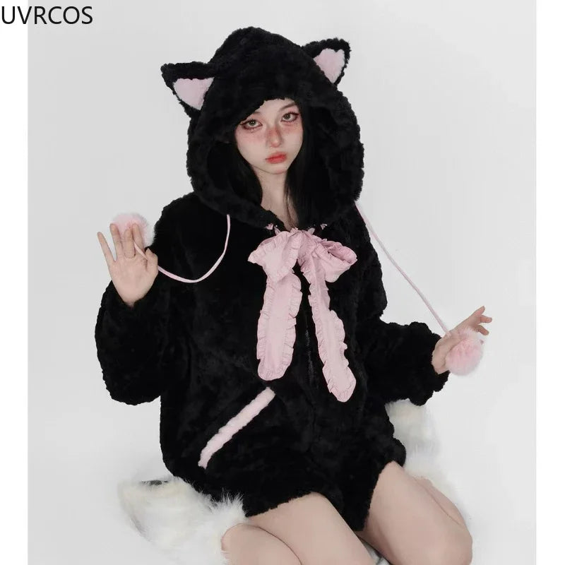 Autumn Winter Harajuku Y2k Thick Hoodies Women Kawaii Bow Cat Ear Hooded Coat Girls Gothic Casual Loose Sweatshirts Cute Clothes