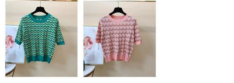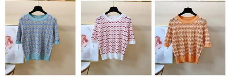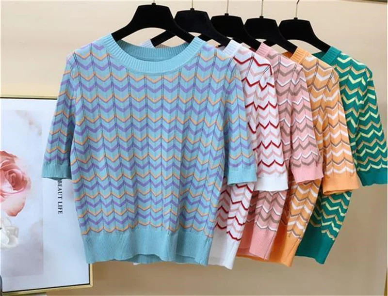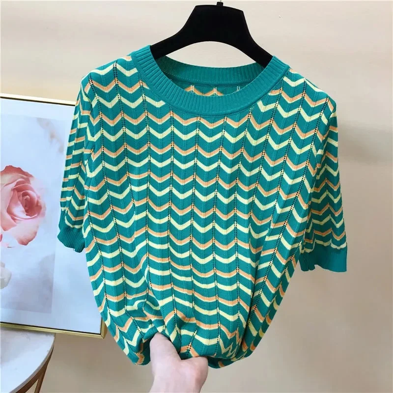 Casual Hollow Out Stripe Knitted Short Sleeve Top Women New Summer Thin Short T-shirt Korean Fashion Plus Size 4xl O-neck Female