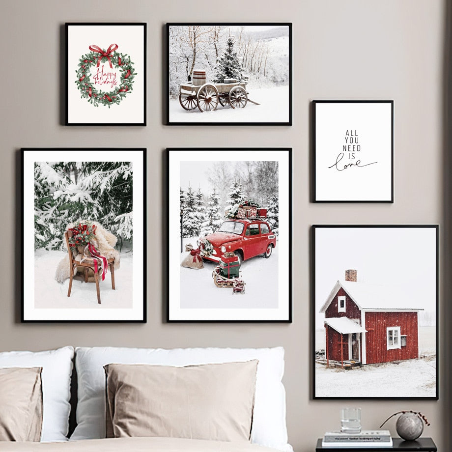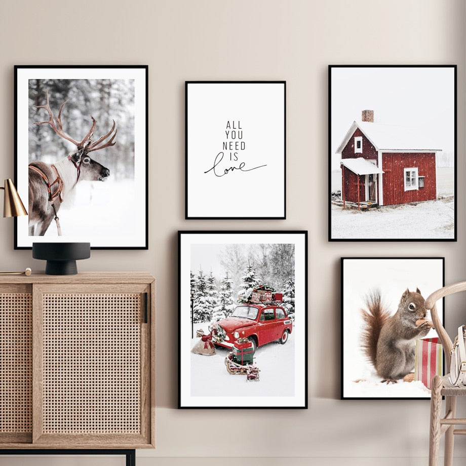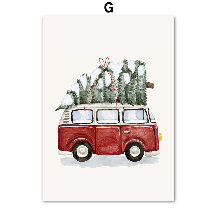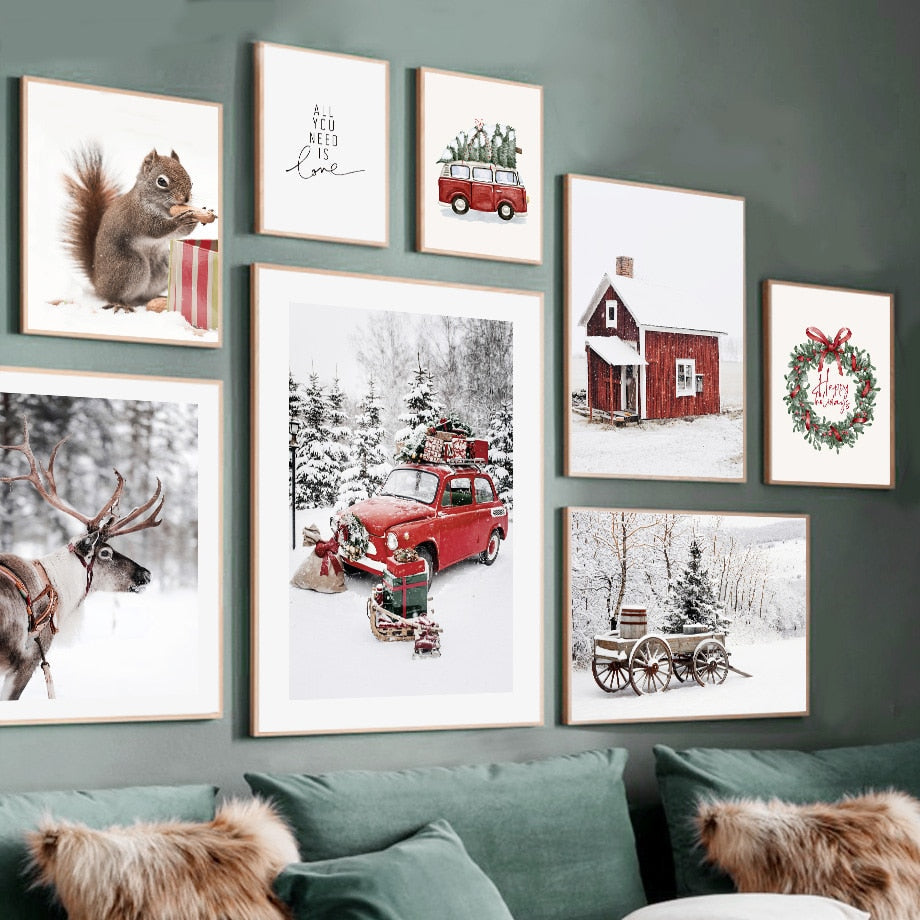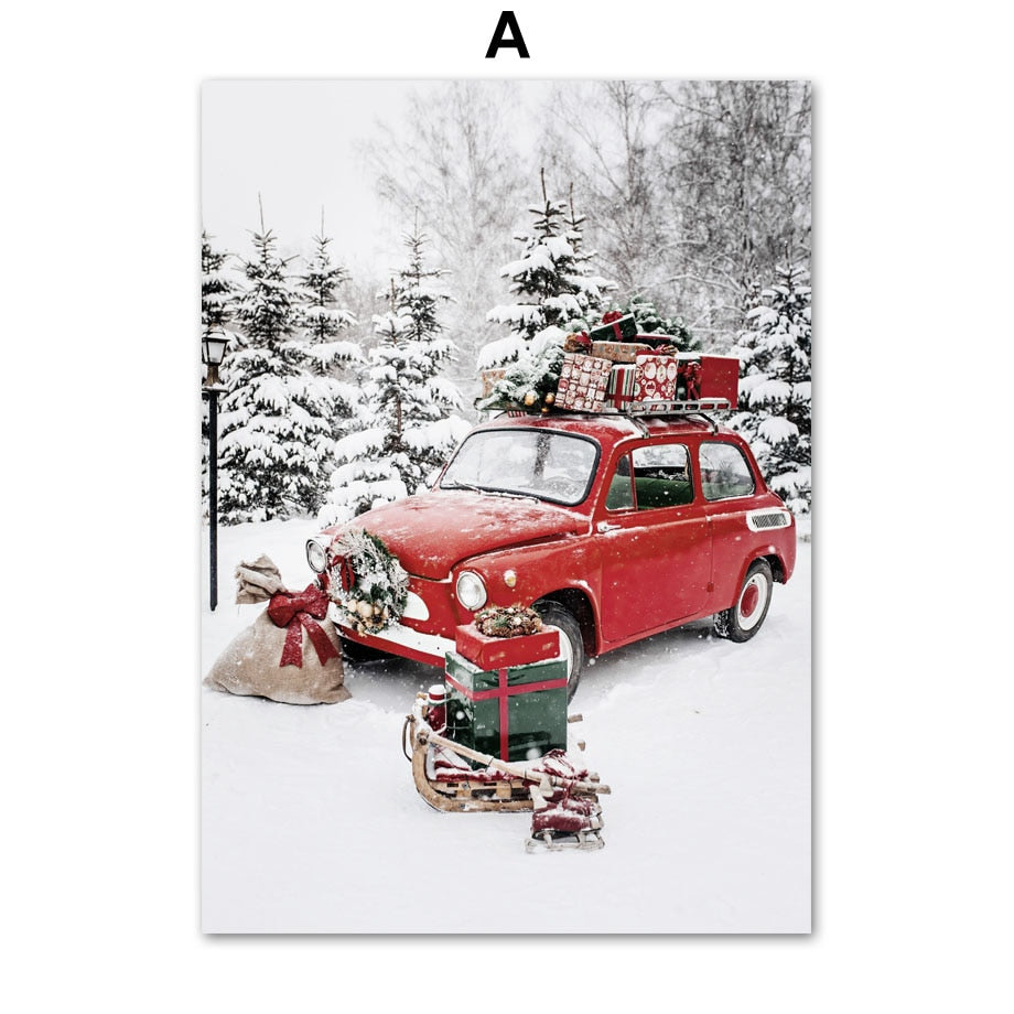 Christmas Red Car Home Elk Squirrel Wall Art Canvas Painting Holiday Living Room Decoration Posters And Prints Wall Pictures