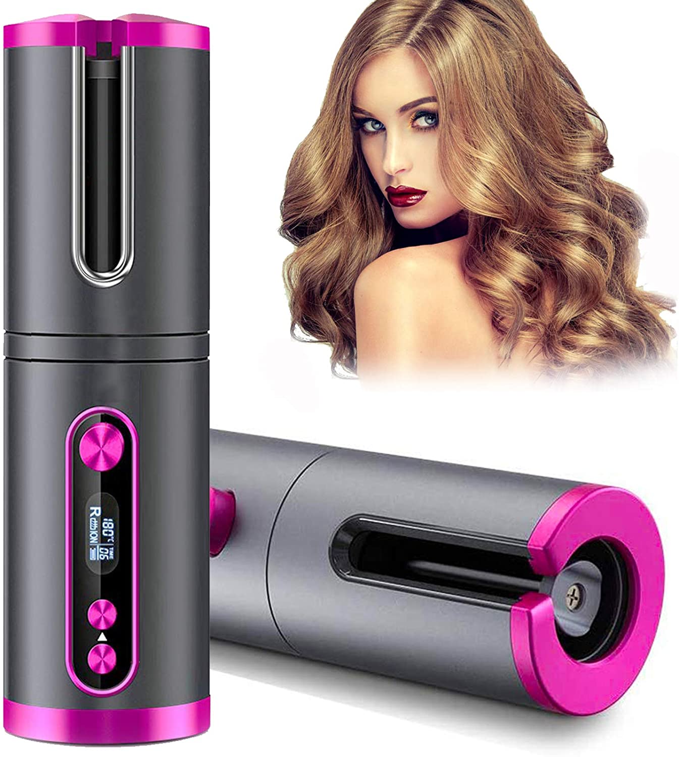 Cordless Hair Curler,Automatic Curling Iron,Auto Hair Curlers with LED Display Adjustable Temperature & Time,Portable Rechargeab
