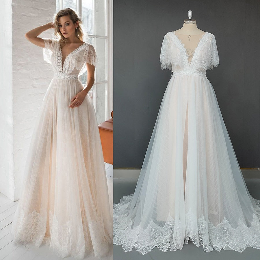 Deep V-Neck Lace Wedding Dress Polka Dots Tulle Custom Made Short Flutter Sleeves Low Cut Back Beach Boho Princess Bridal Gown