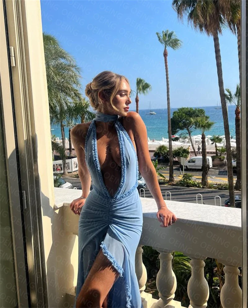Elegant Deep V-neck Blue Prom Evening Gowns Halter Front Slit Cocktail Party Dresses Pleated Lace Fashion Outfits