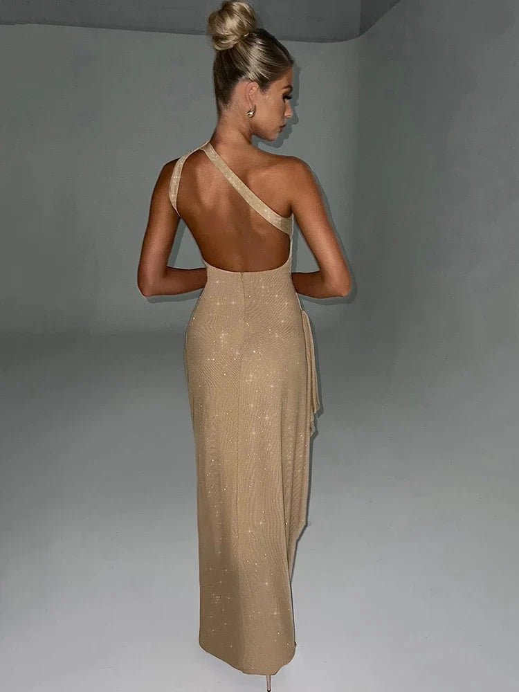 Fashion New One Shoulder High Split Dress Women Bodycon Shiny Backless Elegant Evening Dress Female Charming Party Club