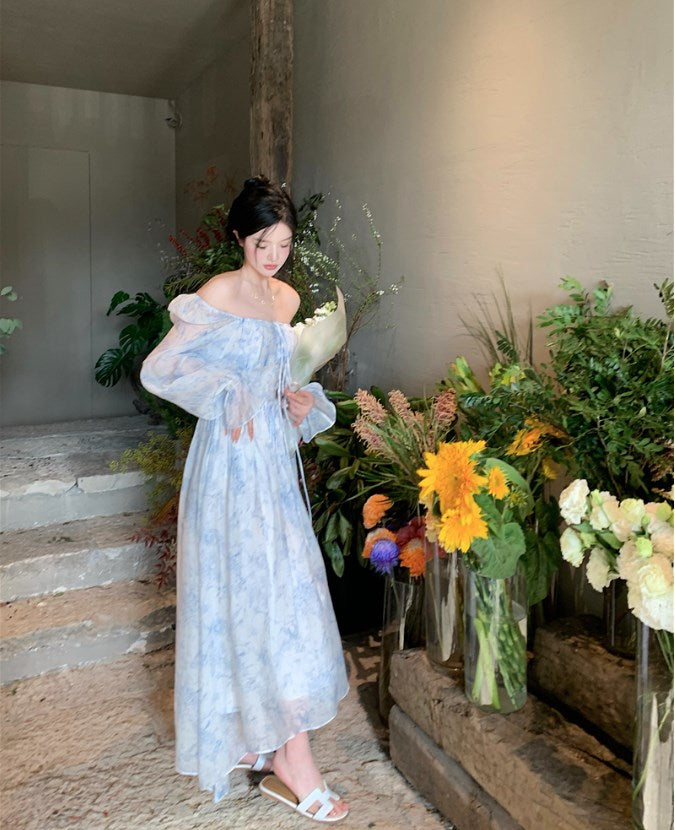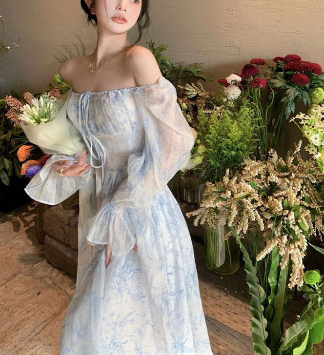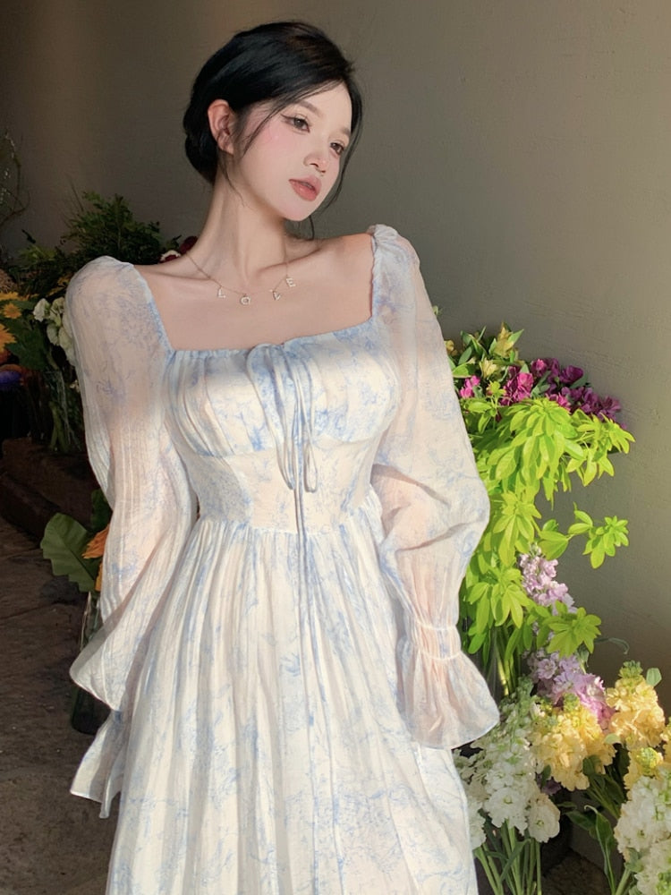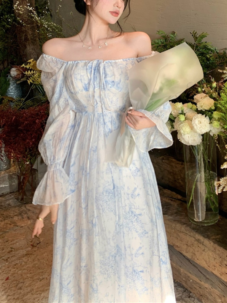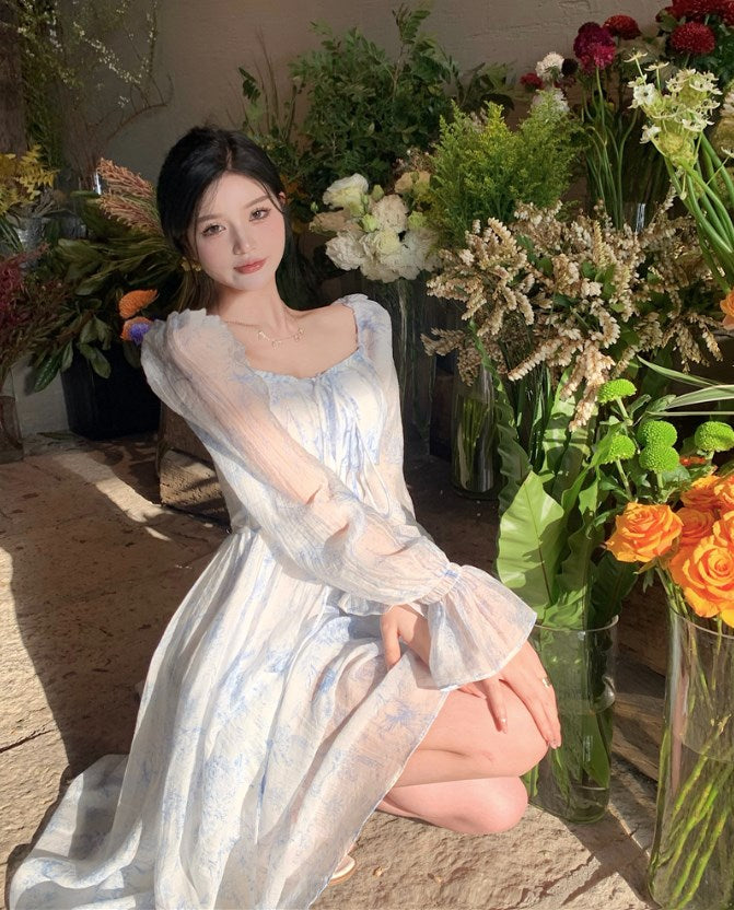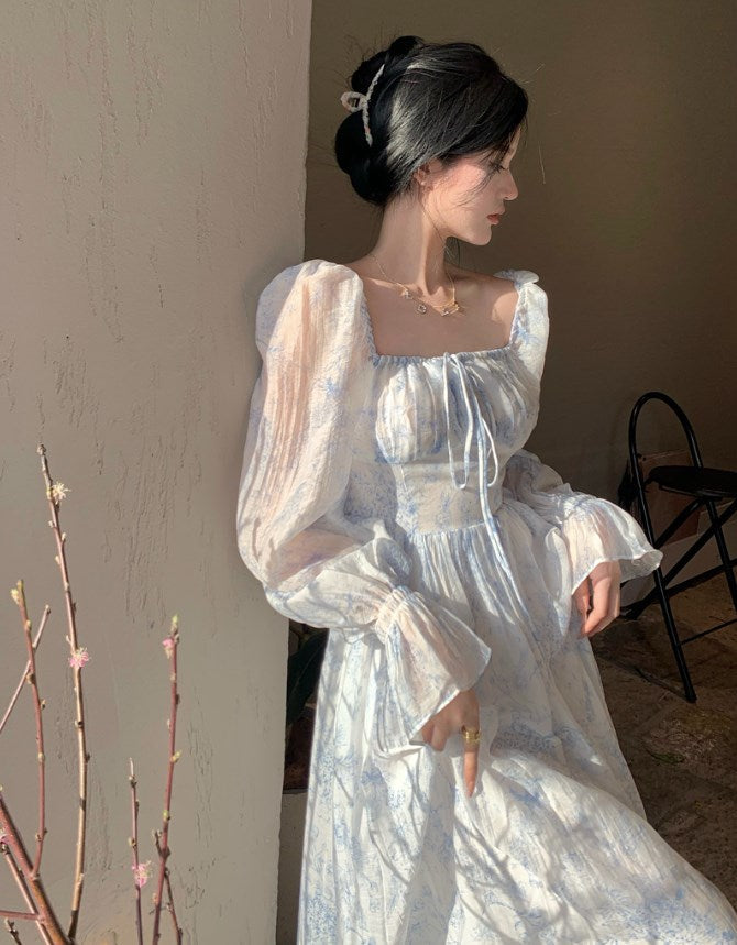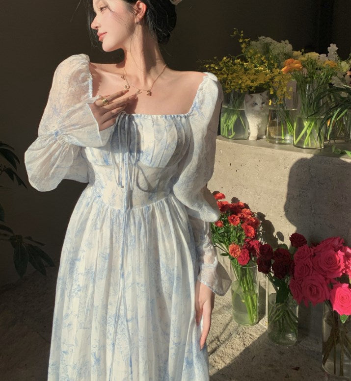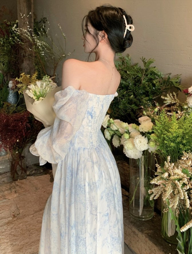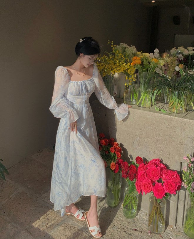 France Floral Sexy Dress Women Elegant Party Midi Dress Casual High Waist Puff Sleeve Korean Fashion Holiday Female Dress Summer