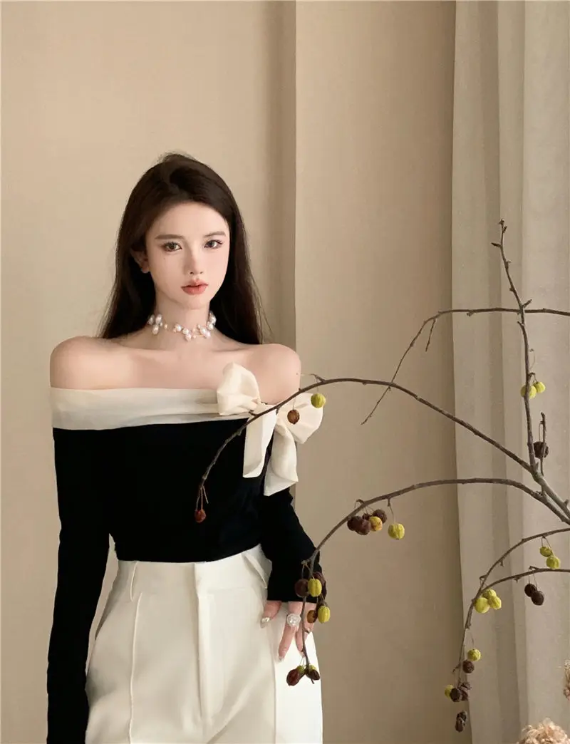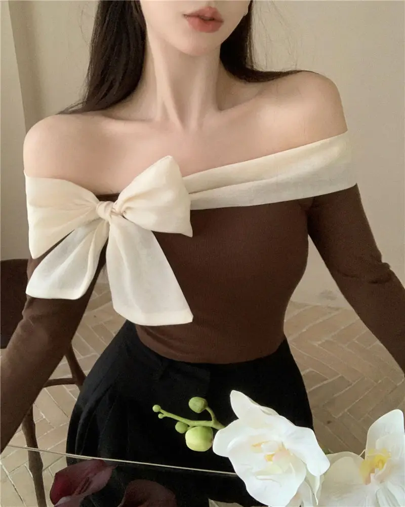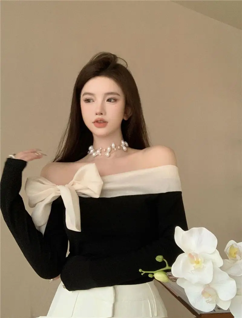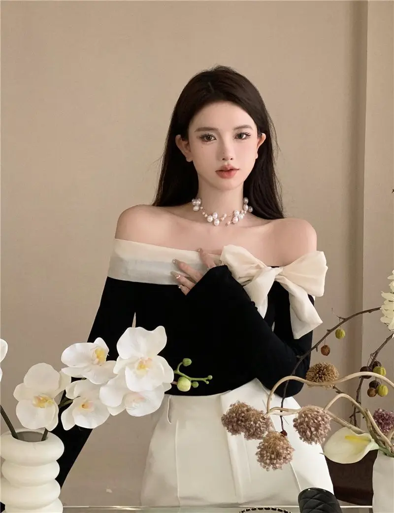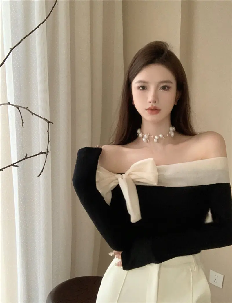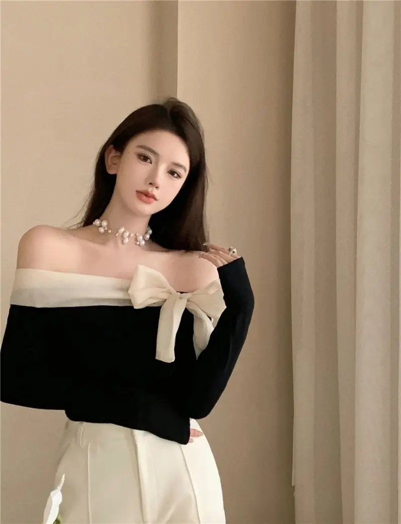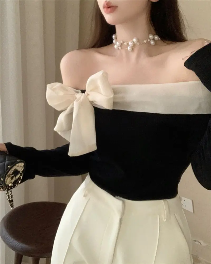 French Style Sweater Women Bow Slash Neck Patchwork Off Shoulder Knitted Tops Sexy Slim Stretch Pullovers Ladies Elegant Jumpers