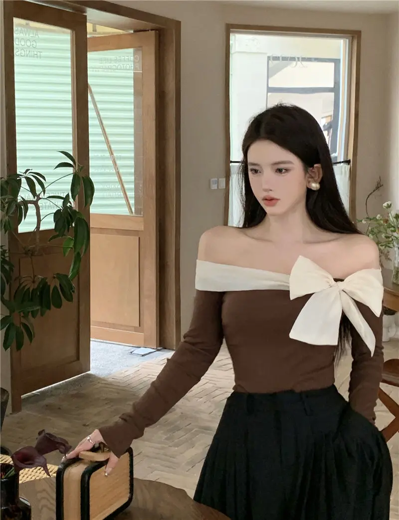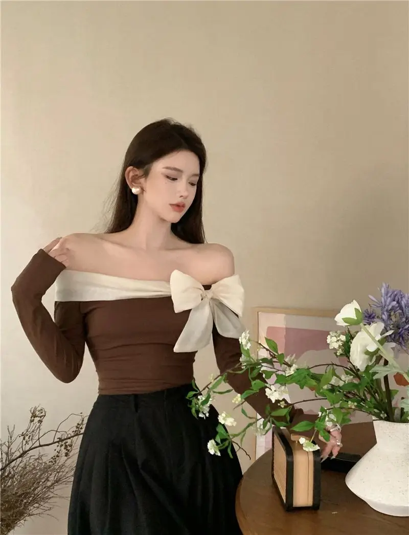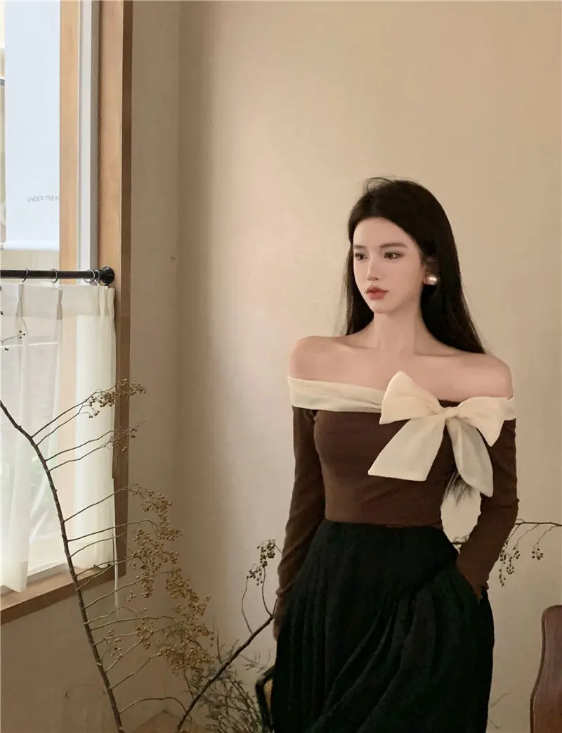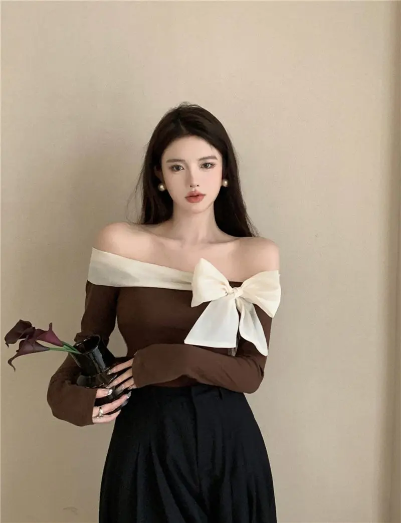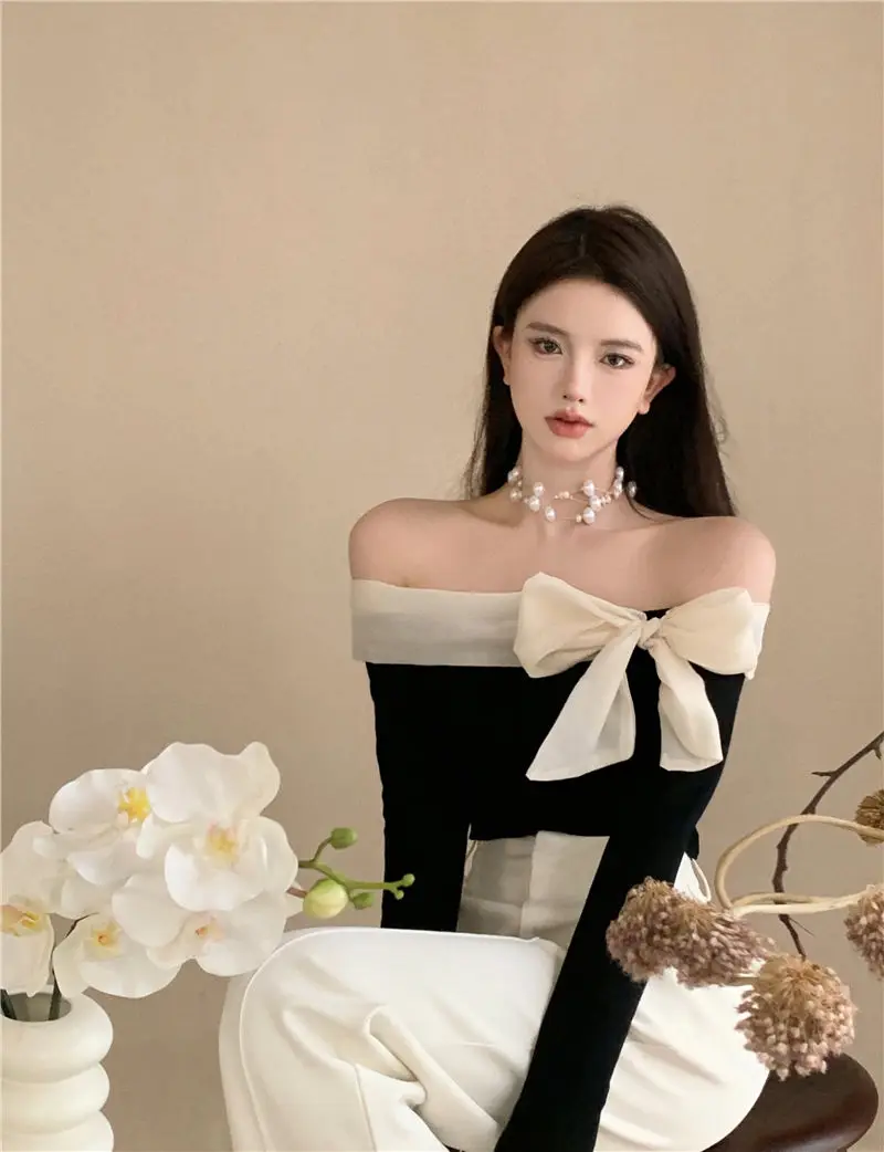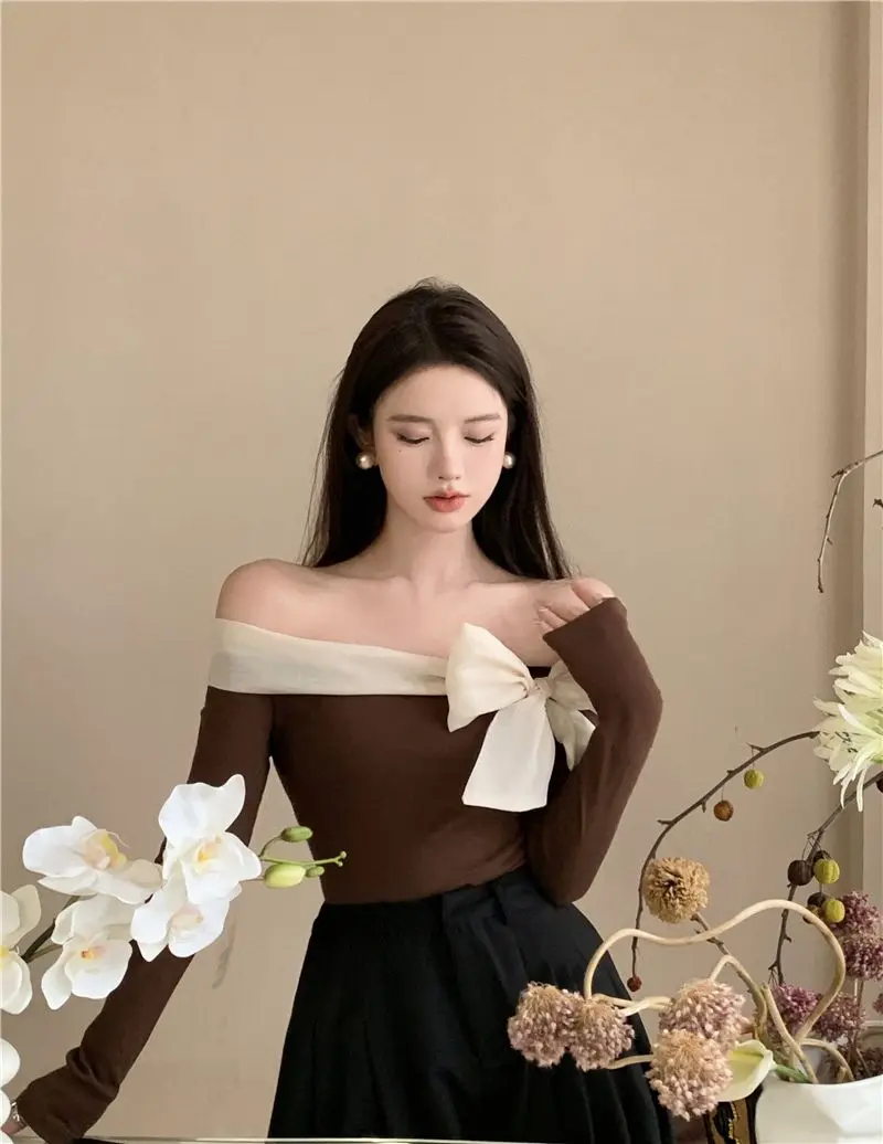 French Style Sweater Women Bow Slash Neck Patchwork Off Shoulder Knitted Tops Sexy Slim Stretch Pullovers Ladies Elegant Jumpers