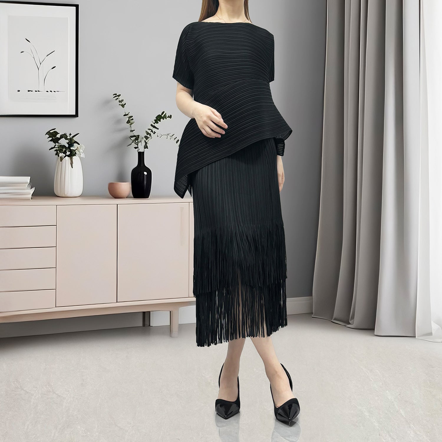 hot-selling suit women's high-end popular black slim short-sleeved T-shirt fringed hip skirt