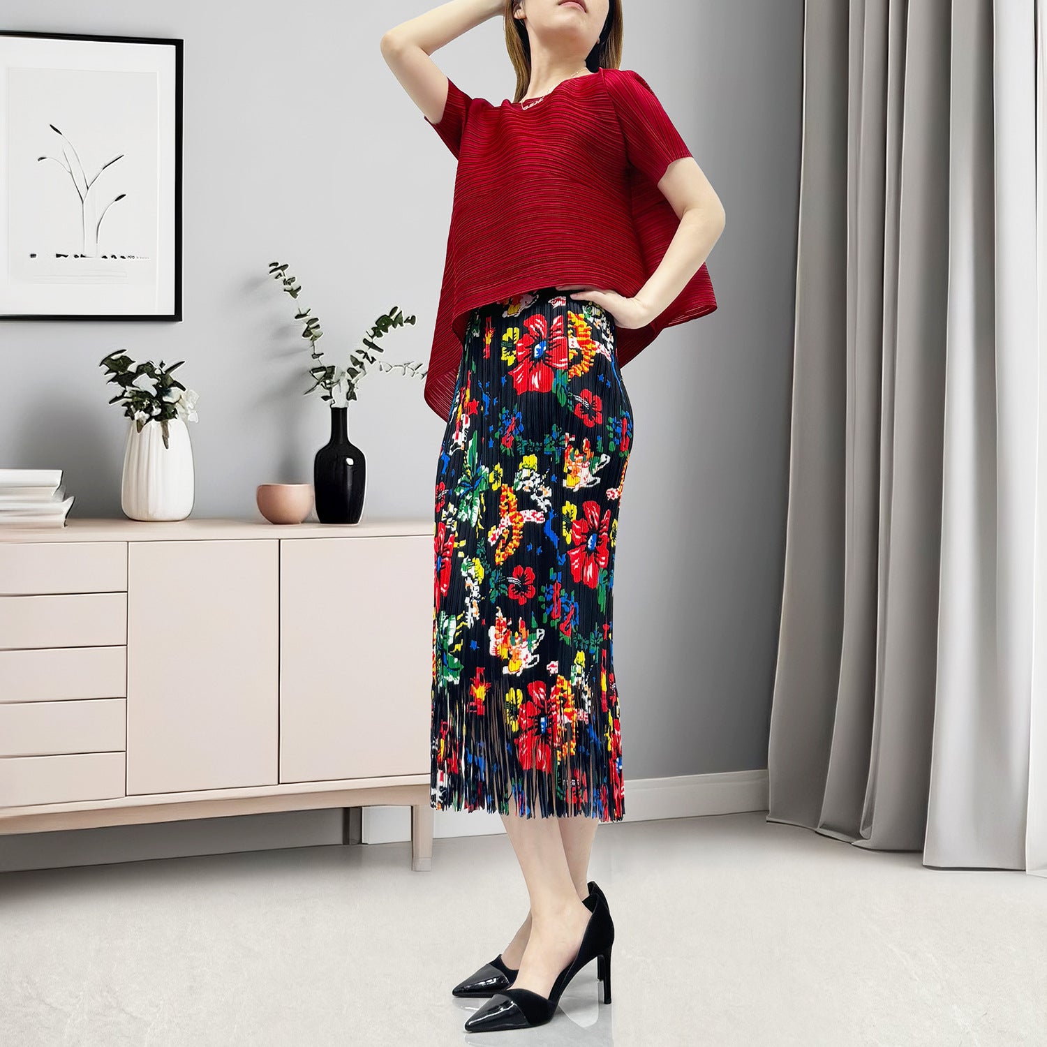 hot-selling women's summer suit two-piece set small retro printed fringed skirt high-end T-shirt