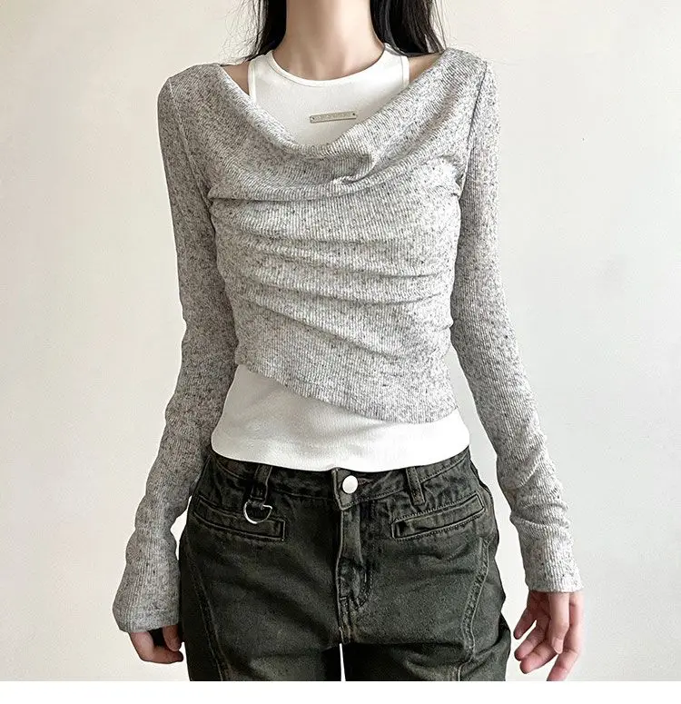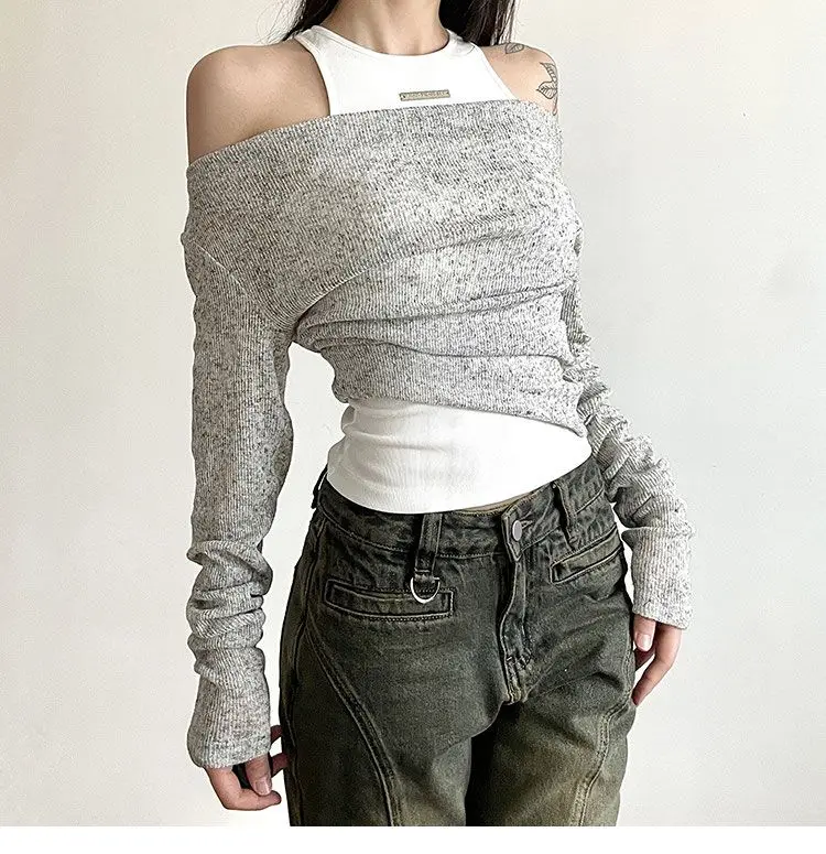 HOUZHOU Two Pieces Set Women Long Sleeve T-shirts Grunge Y2k Aesthetic Vintage Streetwear Solid Crop Top+Bottoming Tanks Fashion