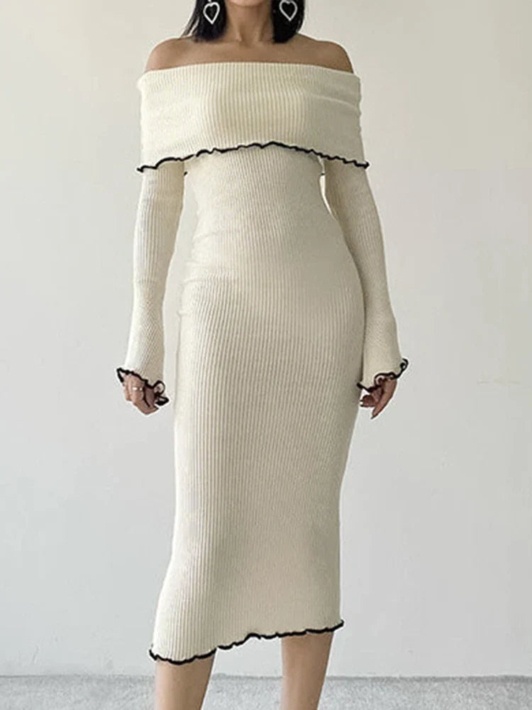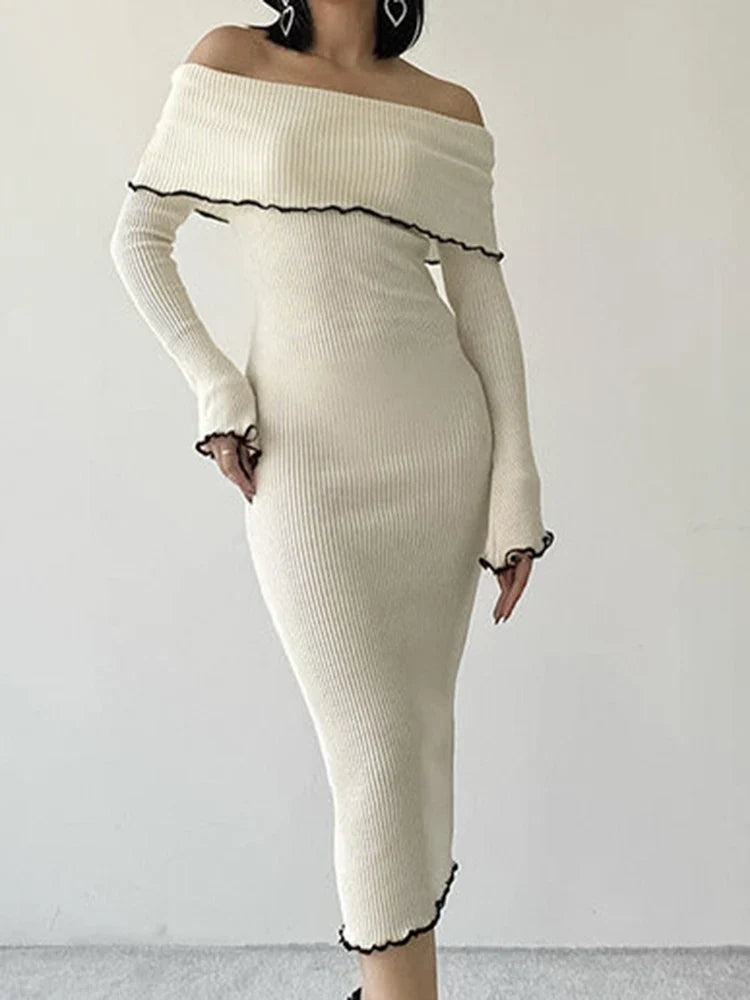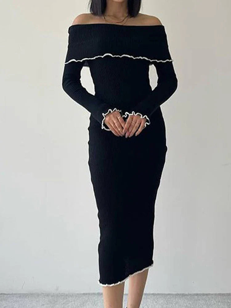Long Dress Women Elegant Sexy Slim Slash Neck Dress Autumn Fashion Bodycon Midi Dress Lady Casual Contrast Color Party Dress