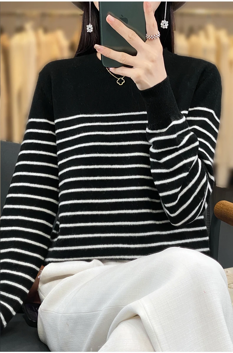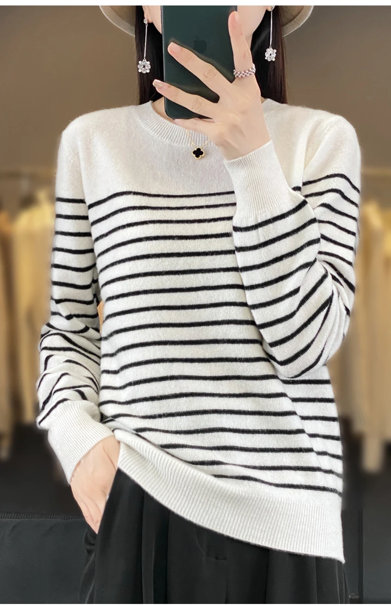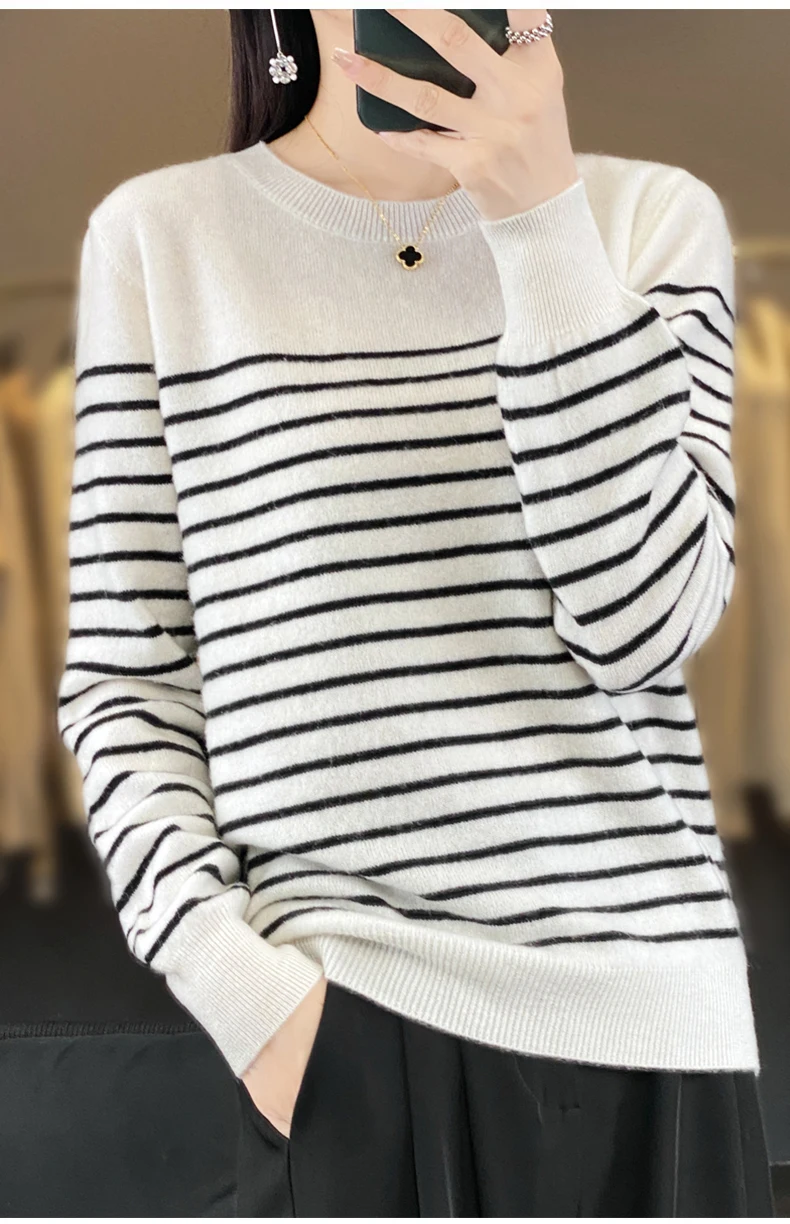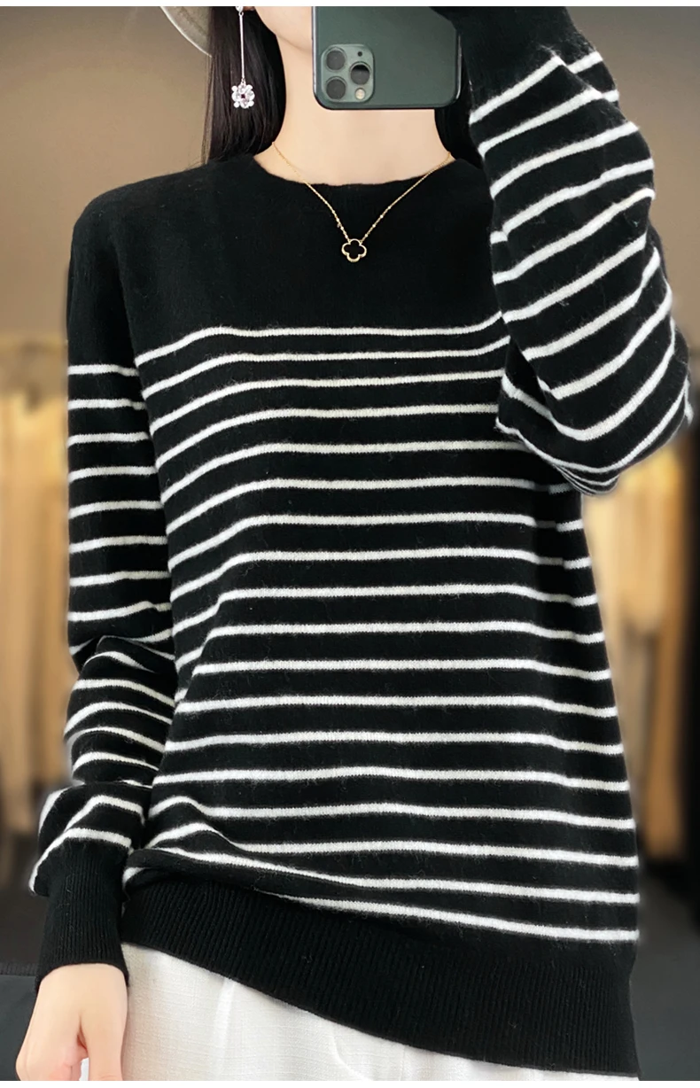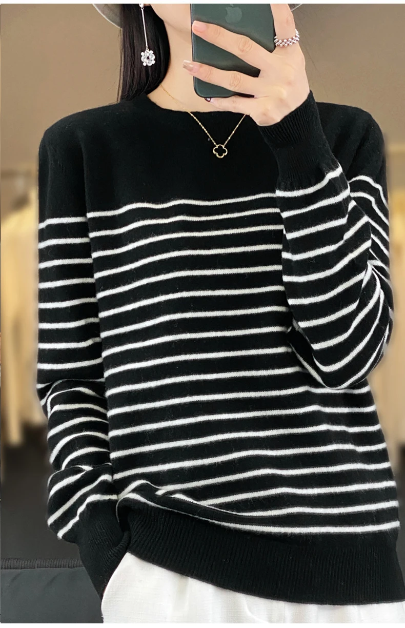 qgtao 2024 autumn/winter striped sweater women's cashmere sweater loose round neck pullover sweater long sleeved bottom sweater