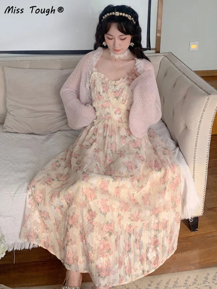 qgtao Elegant Floral Fairy Dress Women Strap Sexy Party Midi Dresses Casual Design Chic Printing High Waist Fashion Female Dress