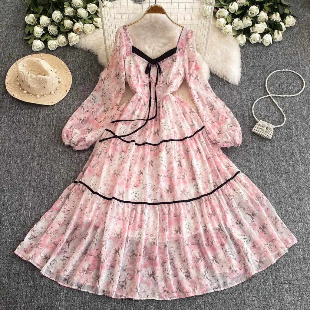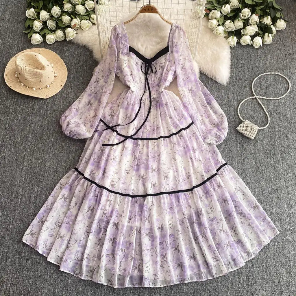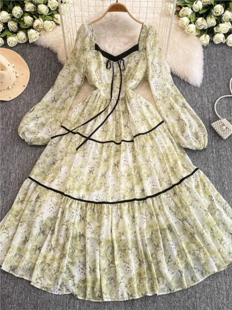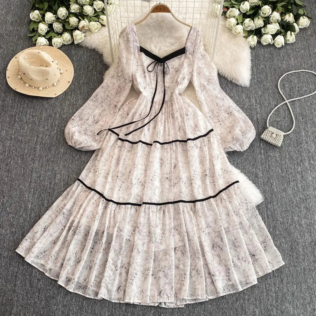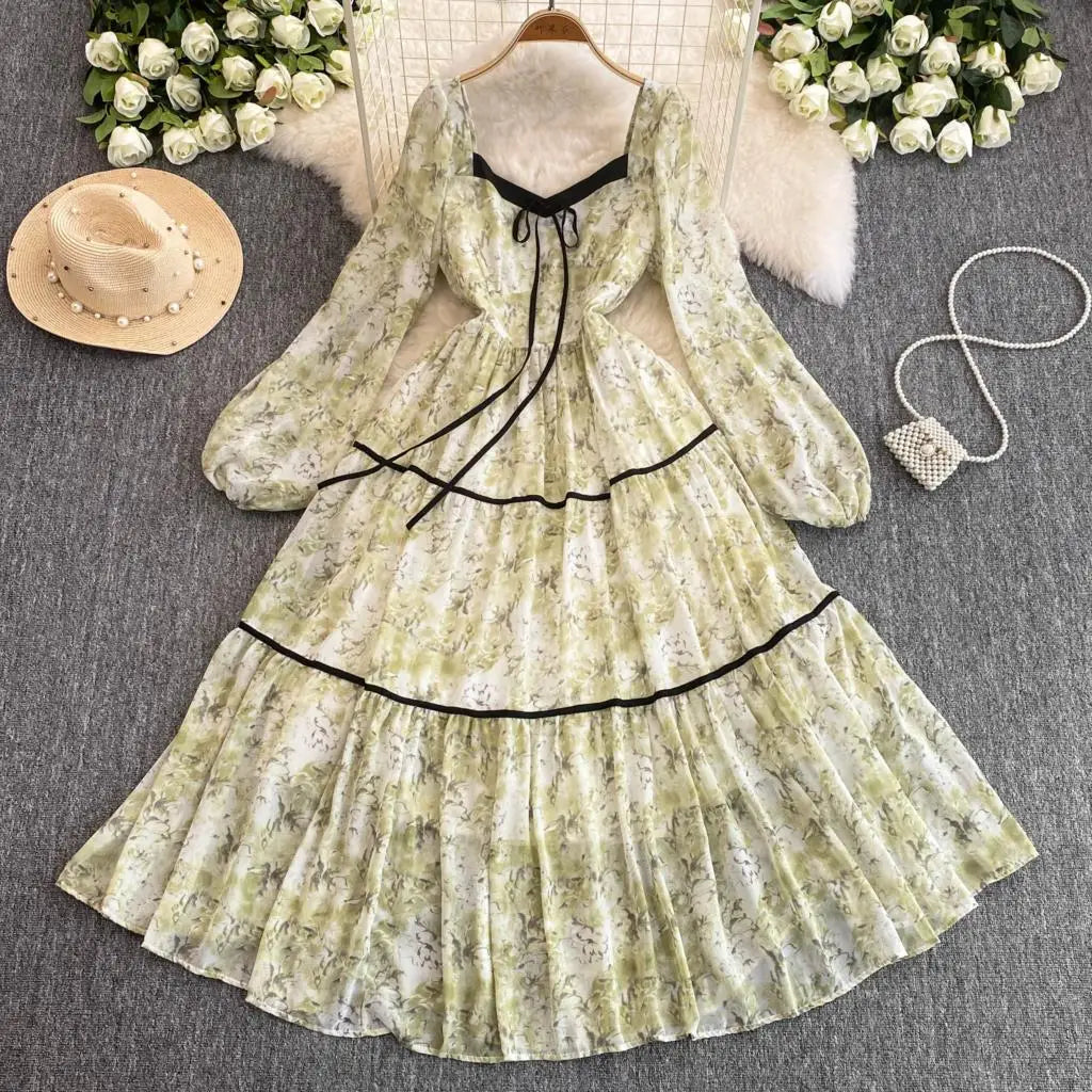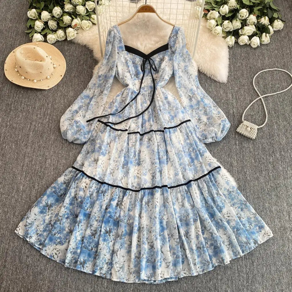 qgtao Elegant Floral Printed Midi Dresses for Women Lantern Sleeves Square Collar A-line Birthday Party Dress Autumn New Prom Robe