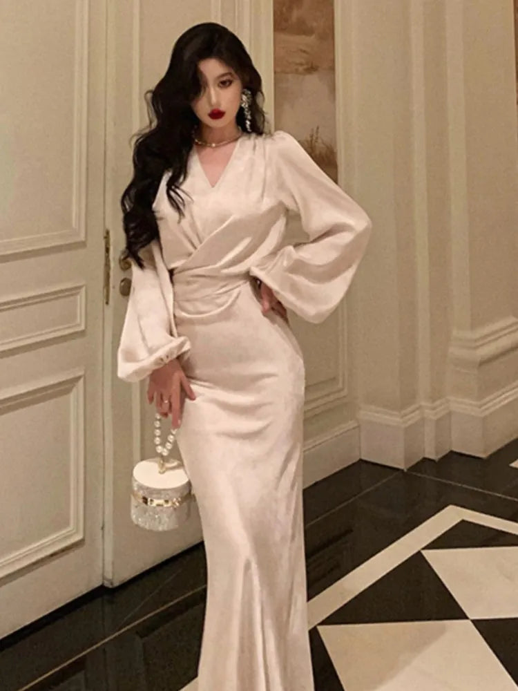 qgtao Elegant Satin Midi Dresses for Women Lantern Sleeve V-neck Lace-up Bodycon Mermaid Evening Party Dress Prom Robe Autumn Vestidos