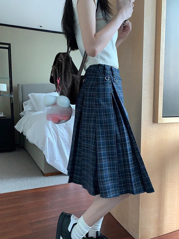 qgtao Korean style Preppy Fashion Vintage Plaid Summer Women Midi Skirt High Waist Pleated A-line Temperament Loose Y2K Skirt
