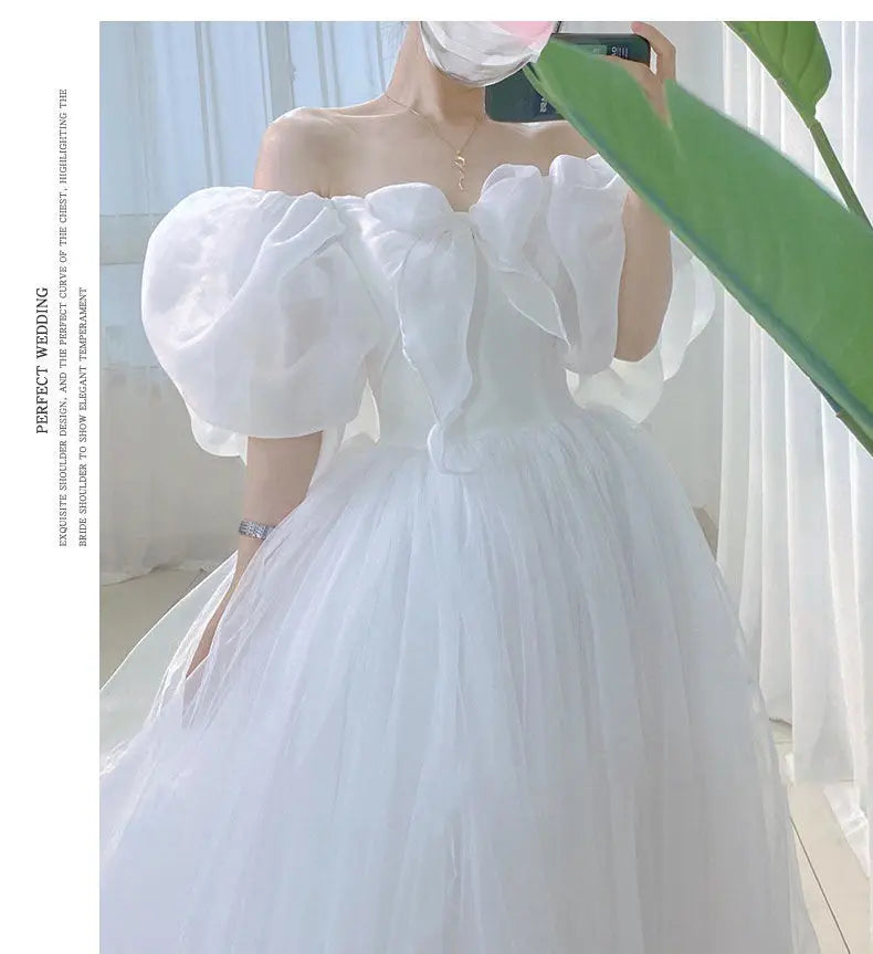 qgtao White Elegant Sweet Princess Dress Women Bow Puff Sleeve Korean Kawaii Midi Dress Female 2024 Autumn Casual Evening Party Dress