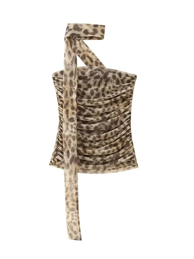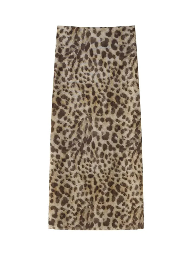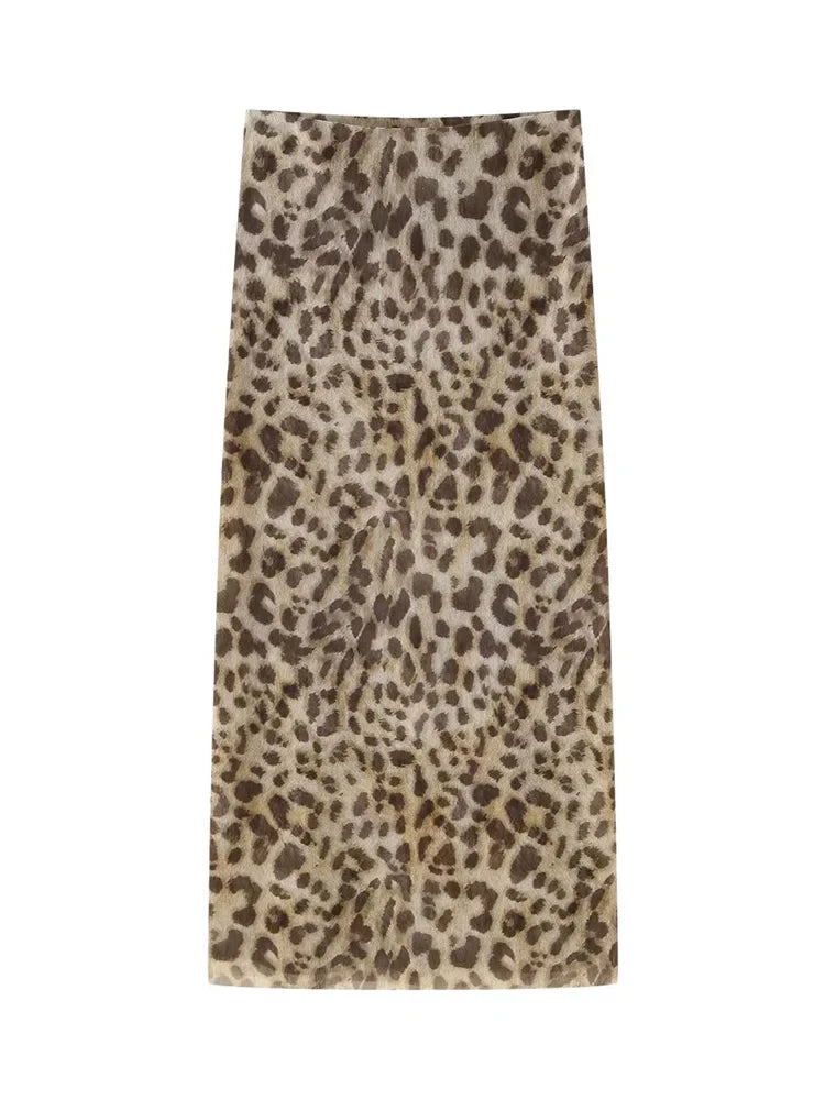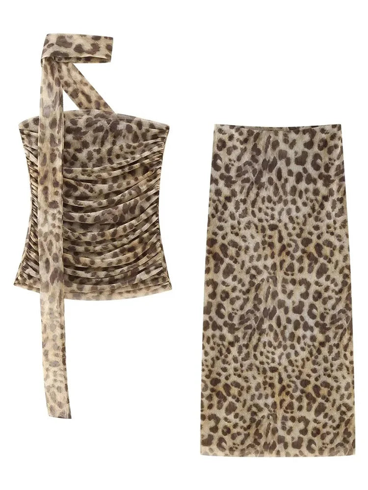 qgtao Women Fashion 2 Piece Set Tulle Leopard Pleated Tops & Vintage High Waist Midi Skirt Female Chic Lady Skirts Set