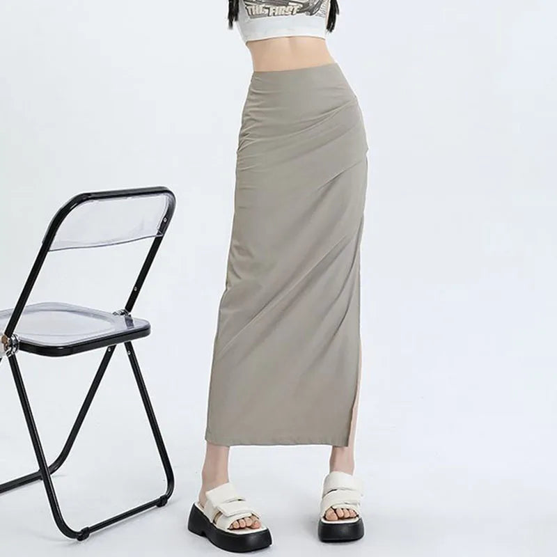 qgtao Y2K Cargo Skirts for Women Korean Style High Waist Slim Fit Long Skirt Woman Sexy Bodycon Side Split Midi Skirts Female