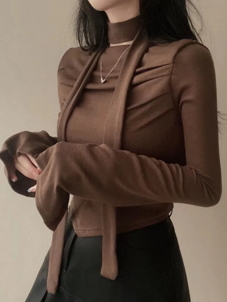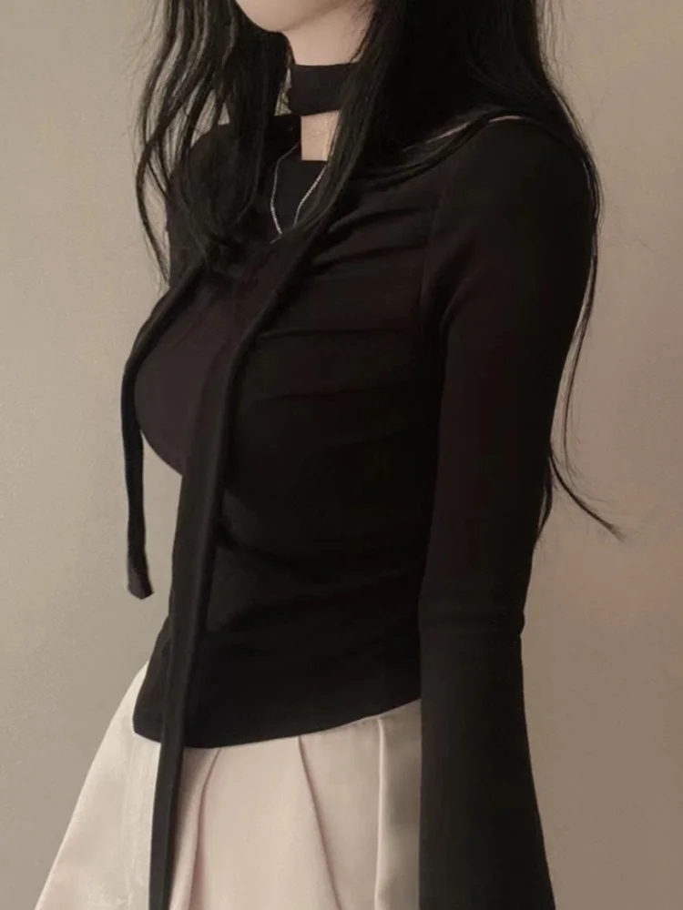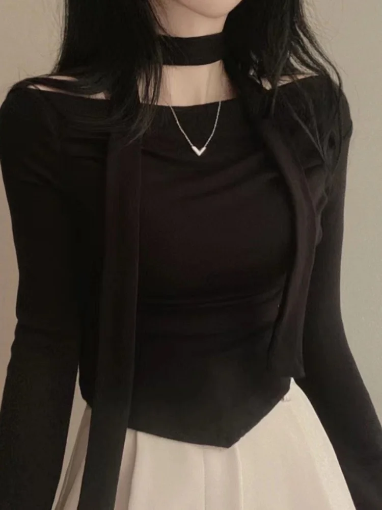 qgtao Y2K Crop T-Shirts Women Hotsweet Chic Long Sleeve Top Female Vintage Fashion Off Shoulder Tee Lady Spring Casual Lace-Up T Shirt