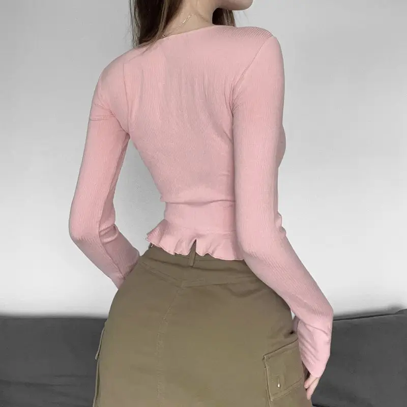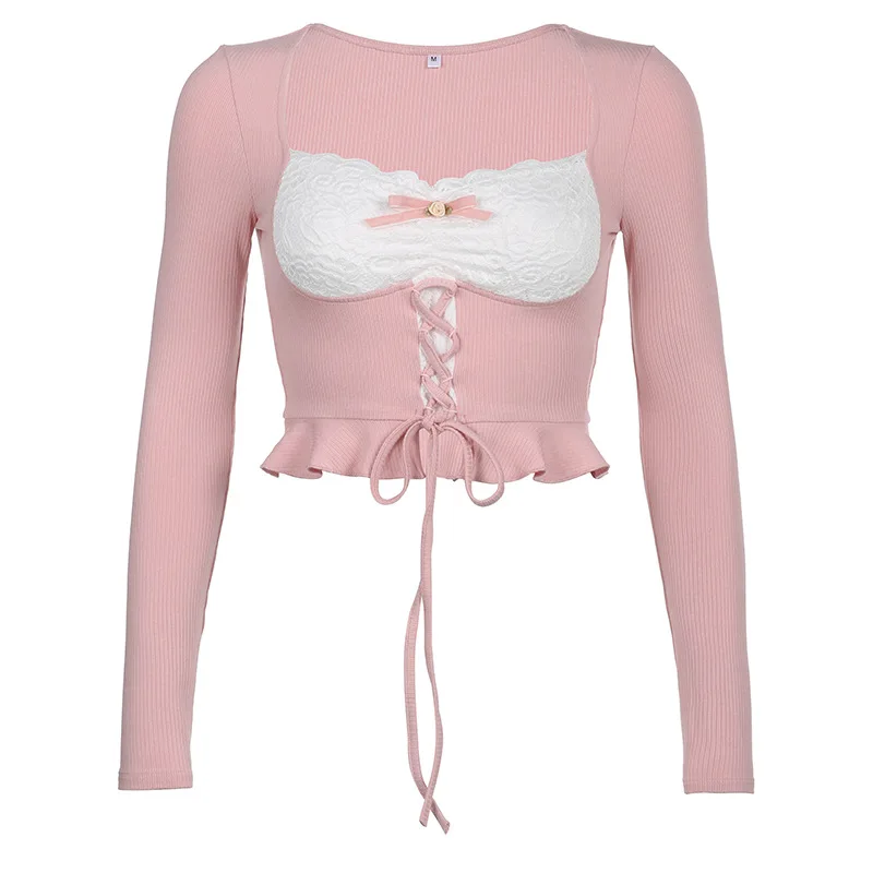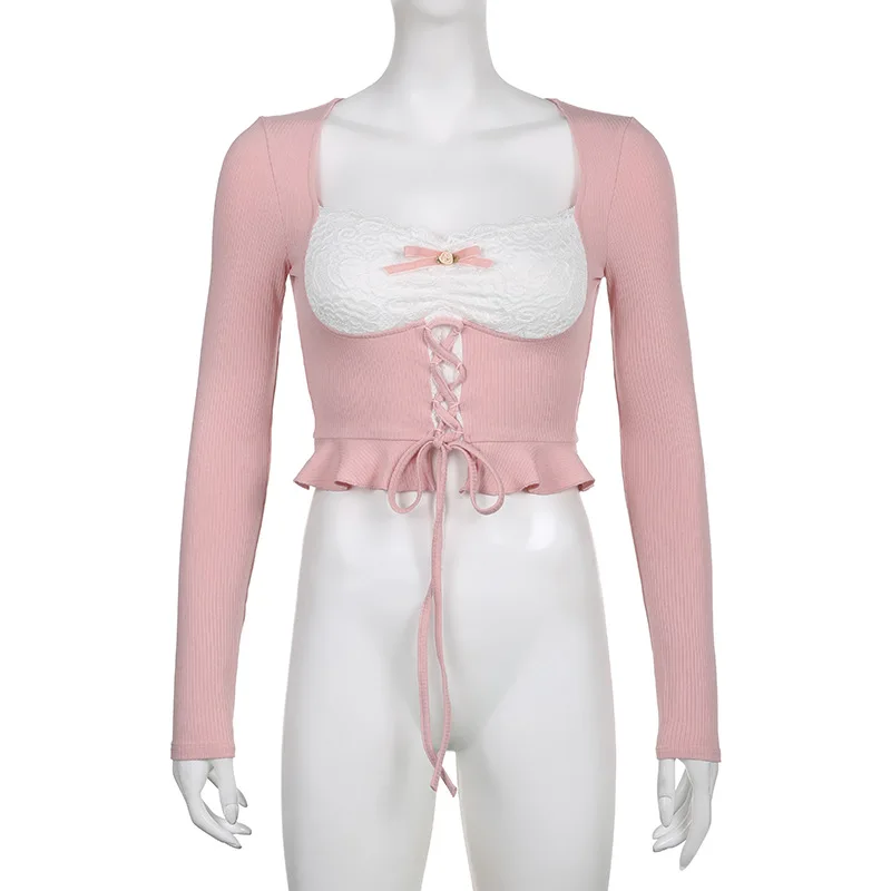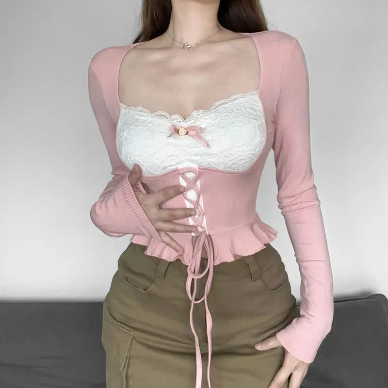 qgtao Y2K Crop T-Shirts Women Sexy Lace Patchwork Top Female Hot Sweet Slim Long Sleeve T Shirt Ladies Korean Square Collar Bandage Tee