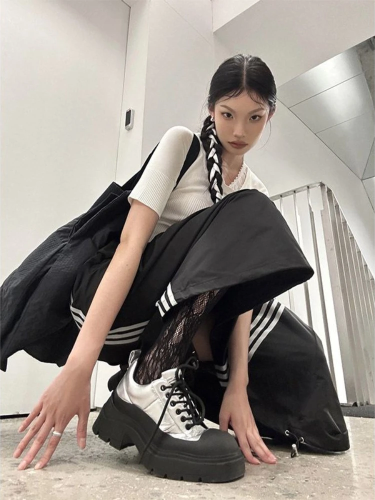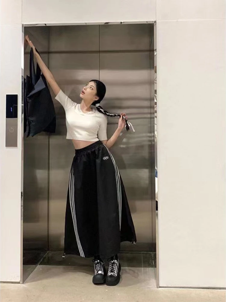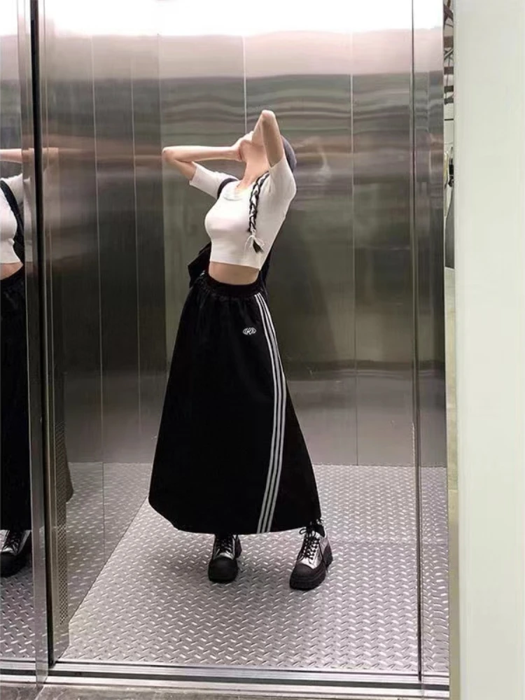 qgtao Y2K Parachute Skirt Women Vintage Streetwear Korean loose Side Striped Black Skirts New Casual Drawstring Aesthetics Skirt 2024