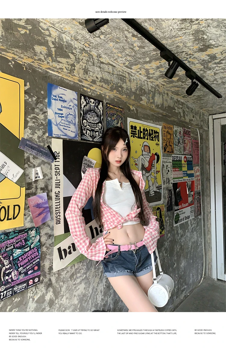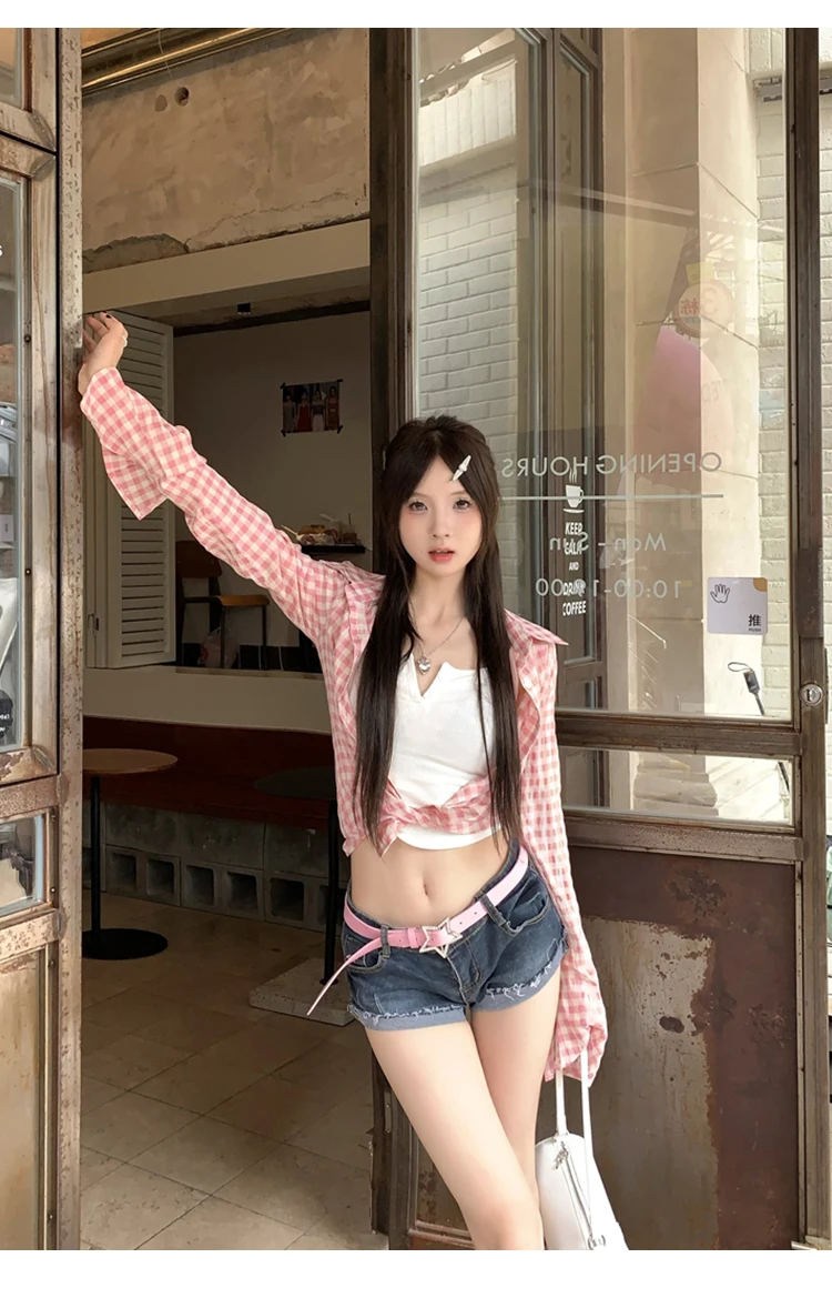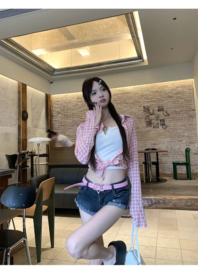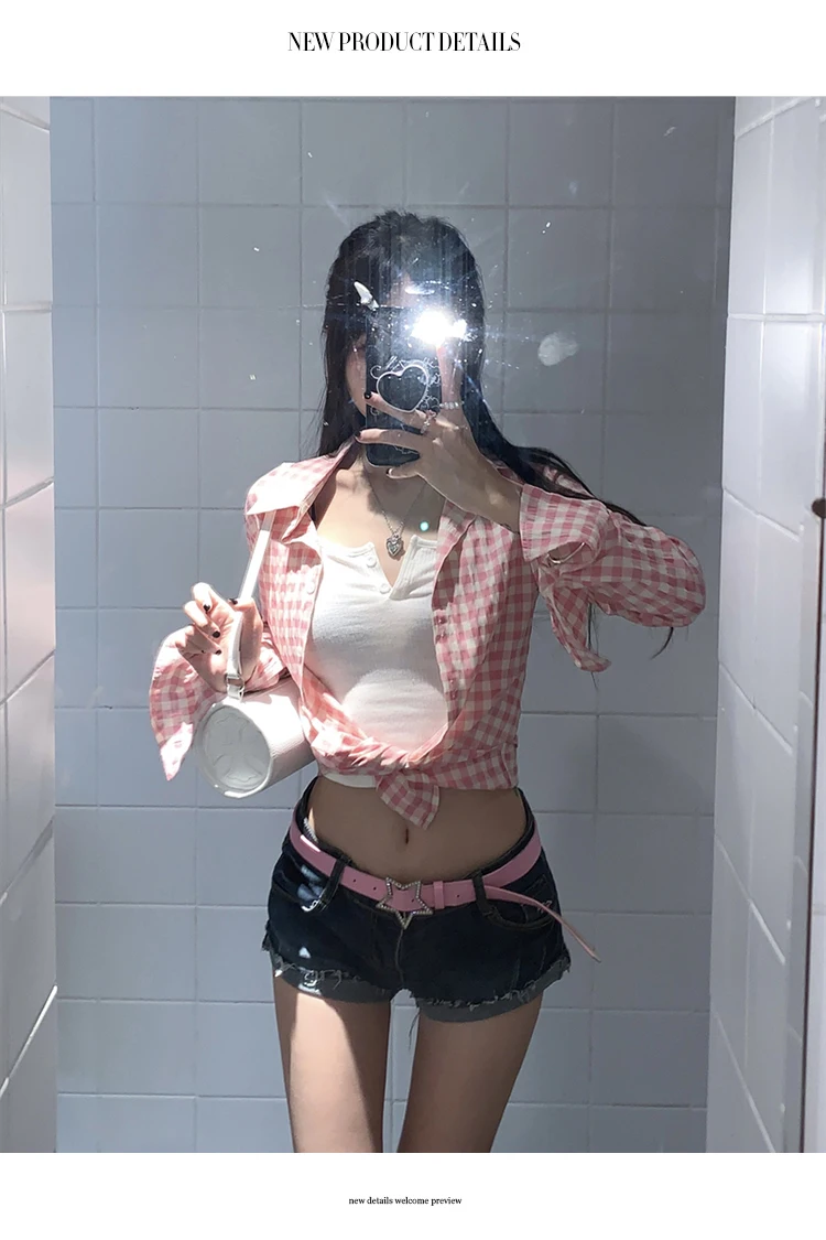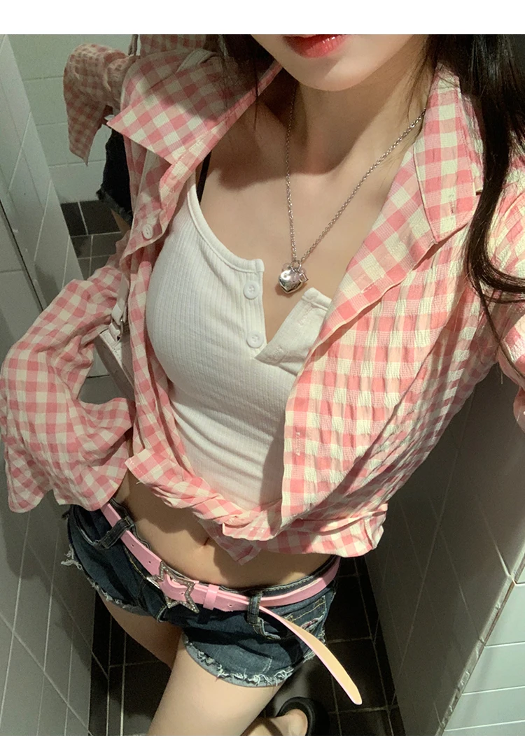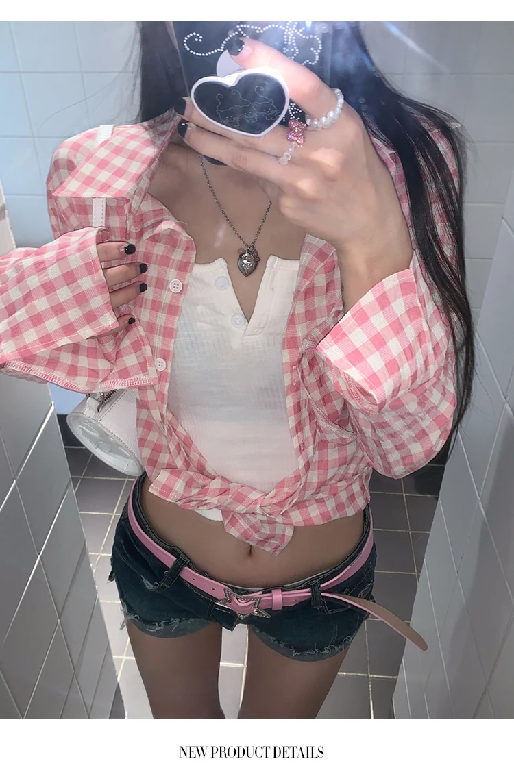 qgtao - Y2k Pink Plaid Women Shirts Check Graphic Long Sleeve Blouses Female Spring Autumn Sexy Slim Button Up Cardigan Chic Ins