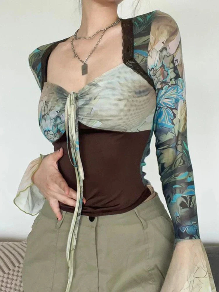 qgtao Y2k Vintage Tie Dye Printed Patchwork Square Neck T-shirt Flare Sleeve Slim Fit Streetwear Spring Autumn Shirts 2024.