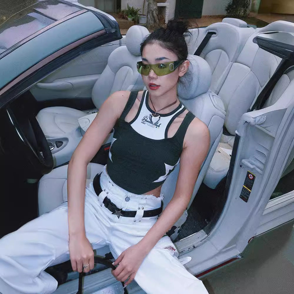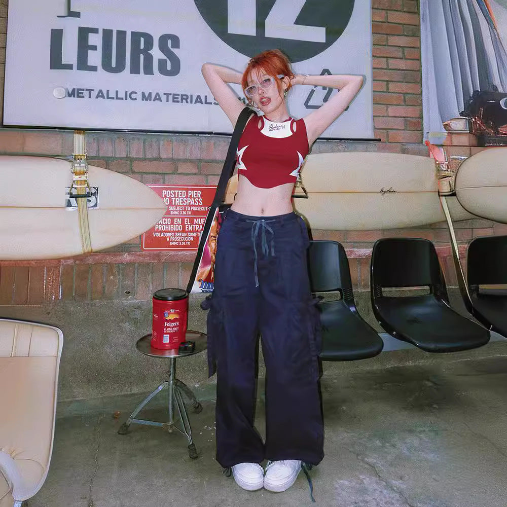 y2k Y2g American Retro Top Star Pattern Print Fake Two-Piece Vest Slim Fit Short T-shirt Female Ins