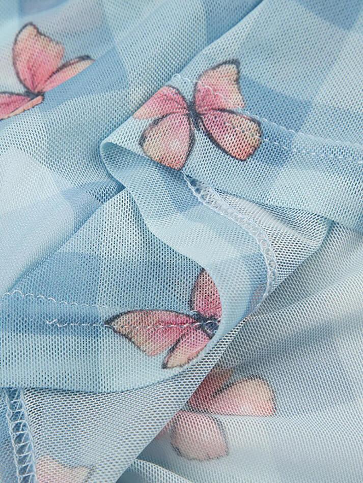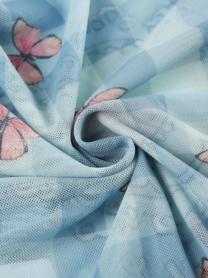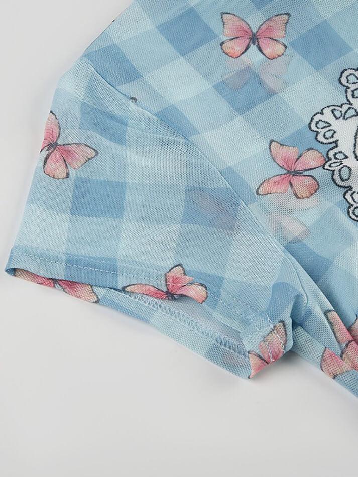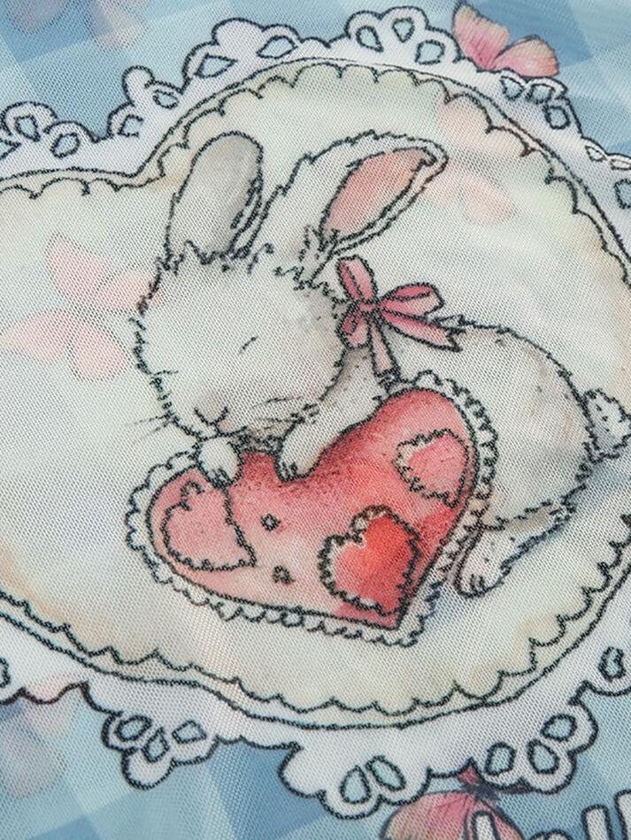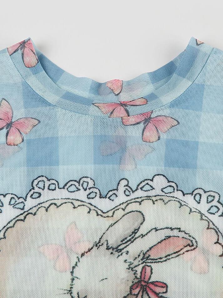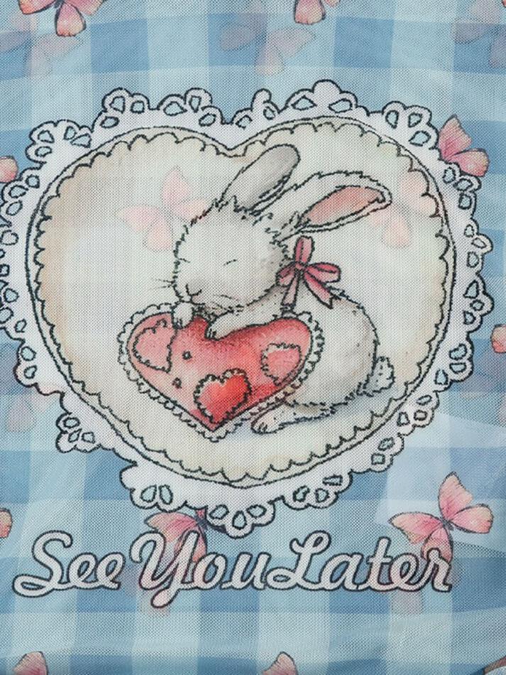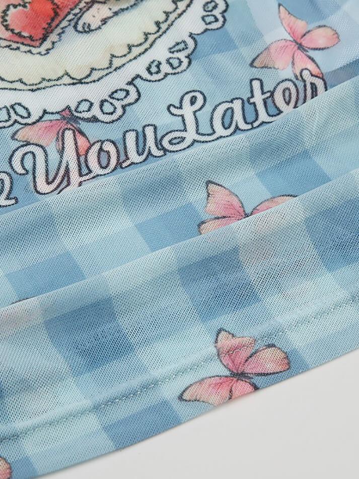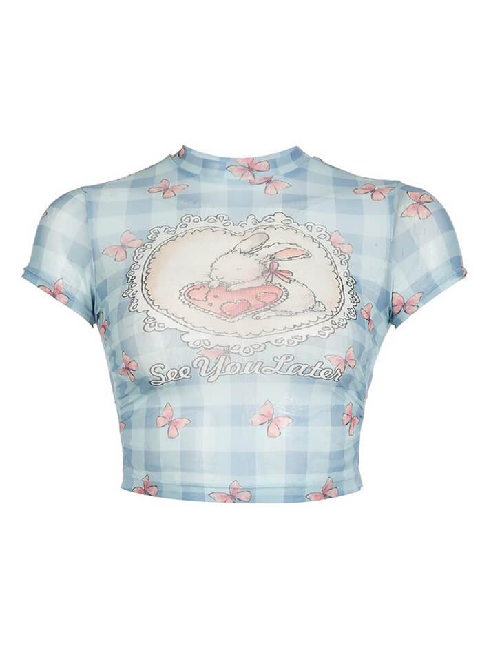 Rabbit & Lettering Print Mesh See-Through Crop Top