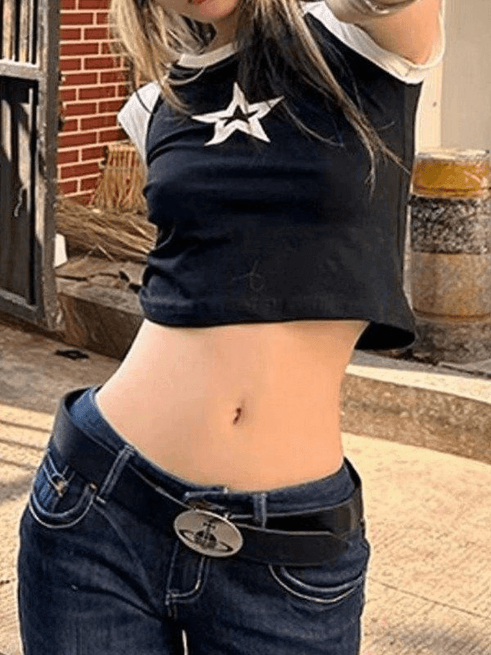 Description: Experience the magic of starry nights with this adorable crop top. Crafted from a soft cotton blend fabric, it offers a slim fit and features contrast patchwork sleeves with seam detail and a charming star print on the front.