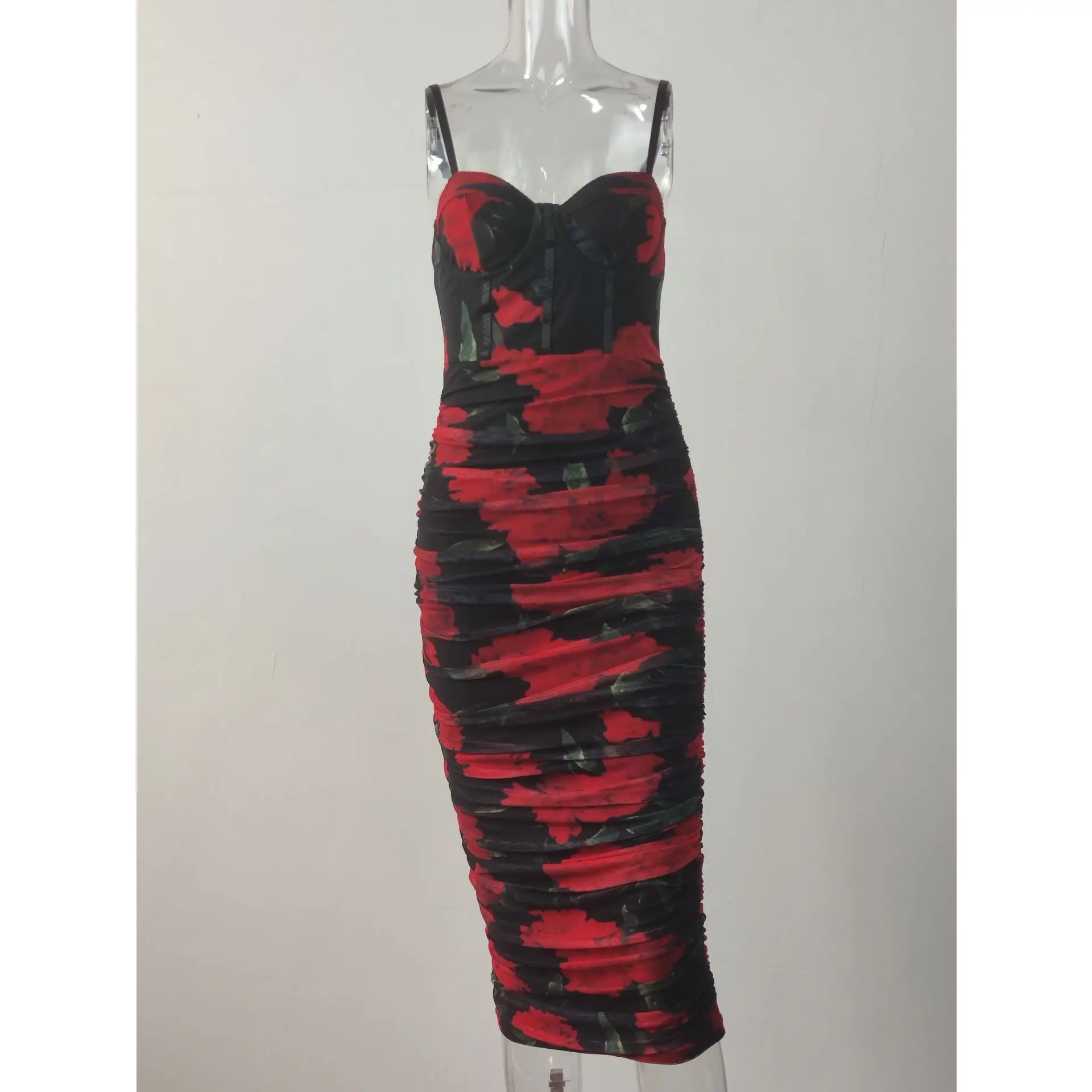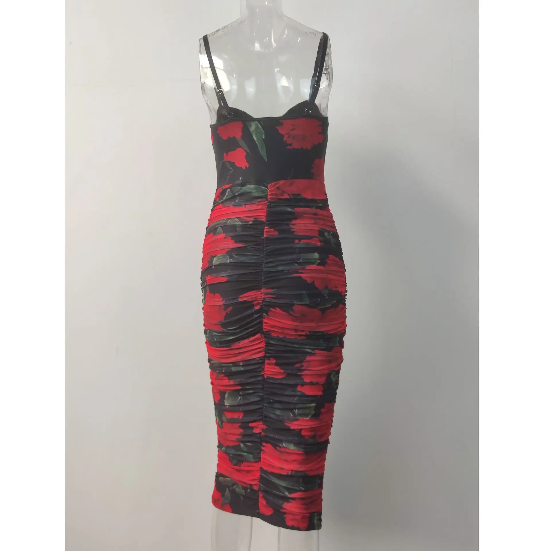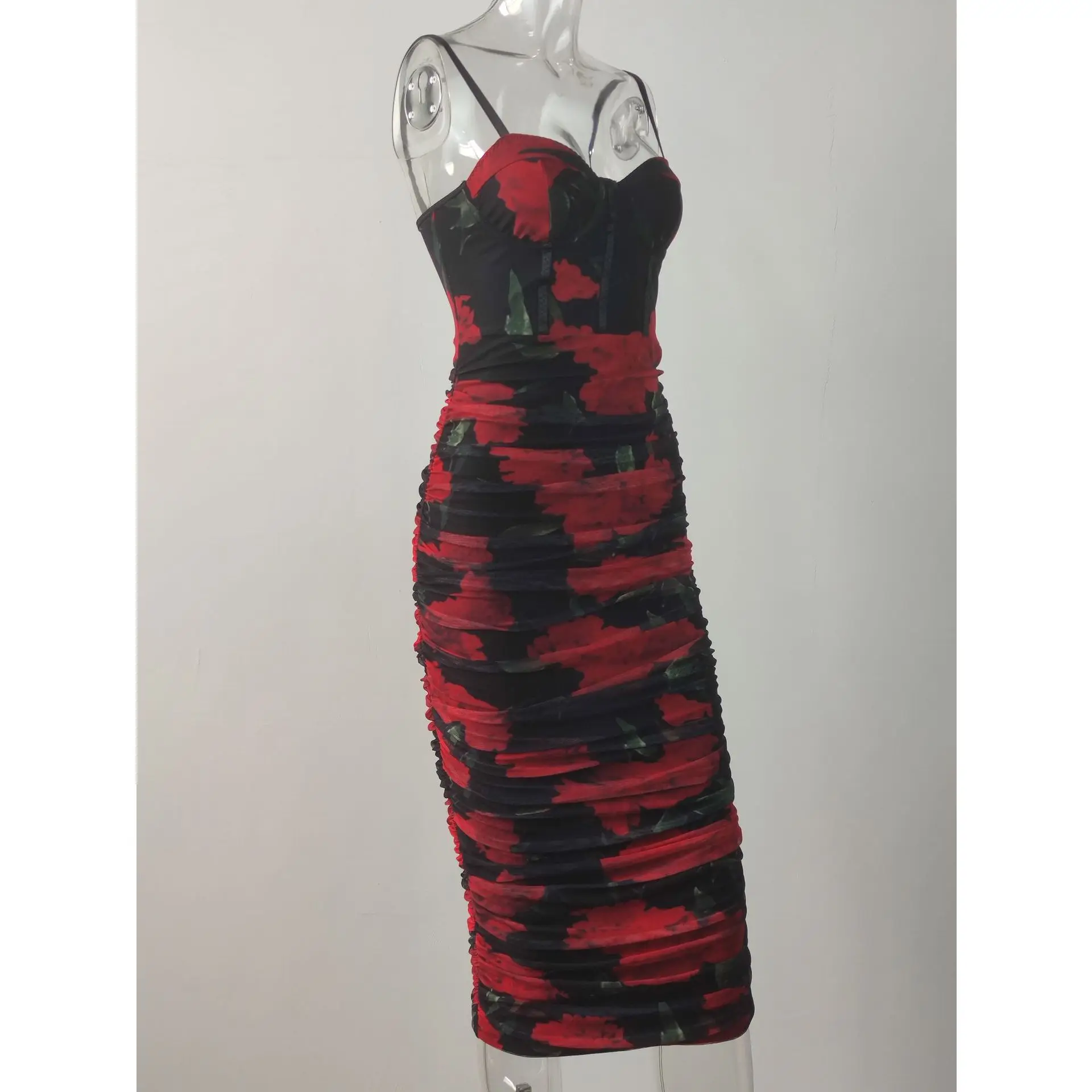 Red Floral Print Tight Fitting Dress Group Dress Women Slim Pleated Wrap Buttocks Long Dress Sexy Backless Spaghetti Strap Dress