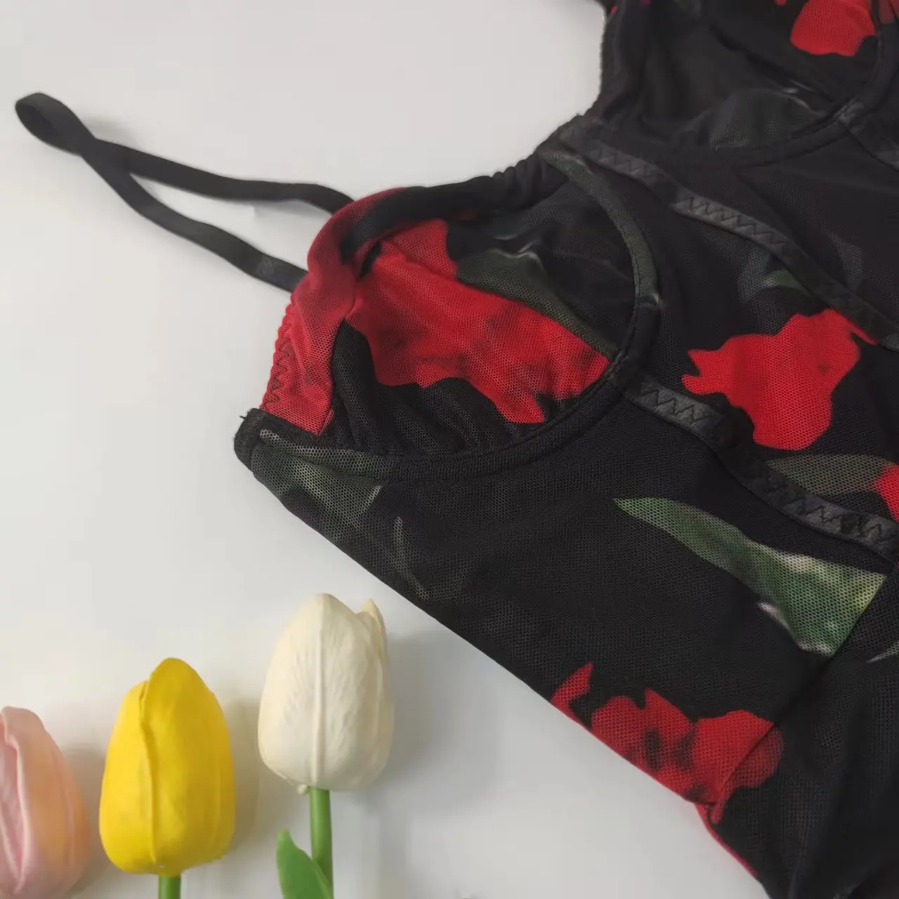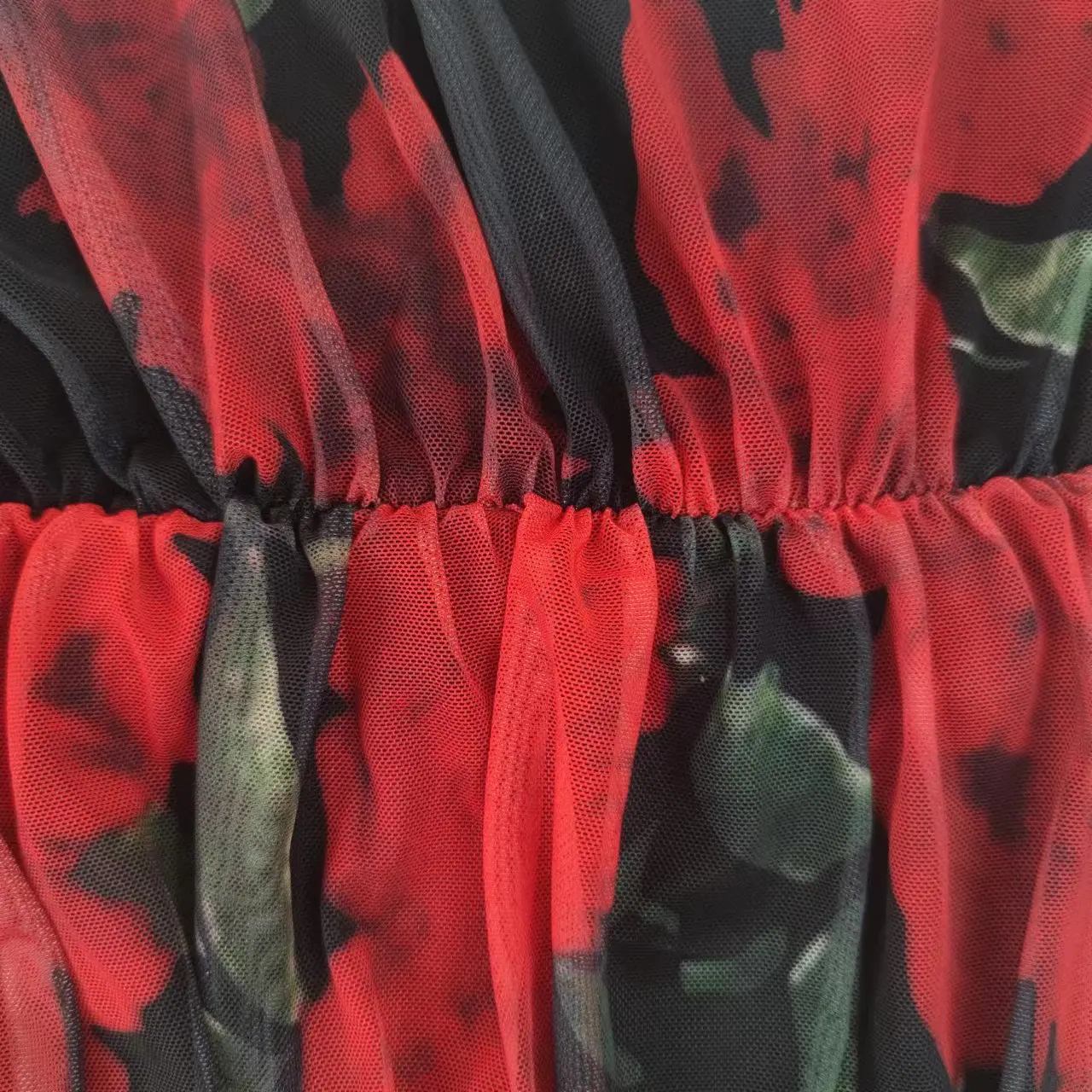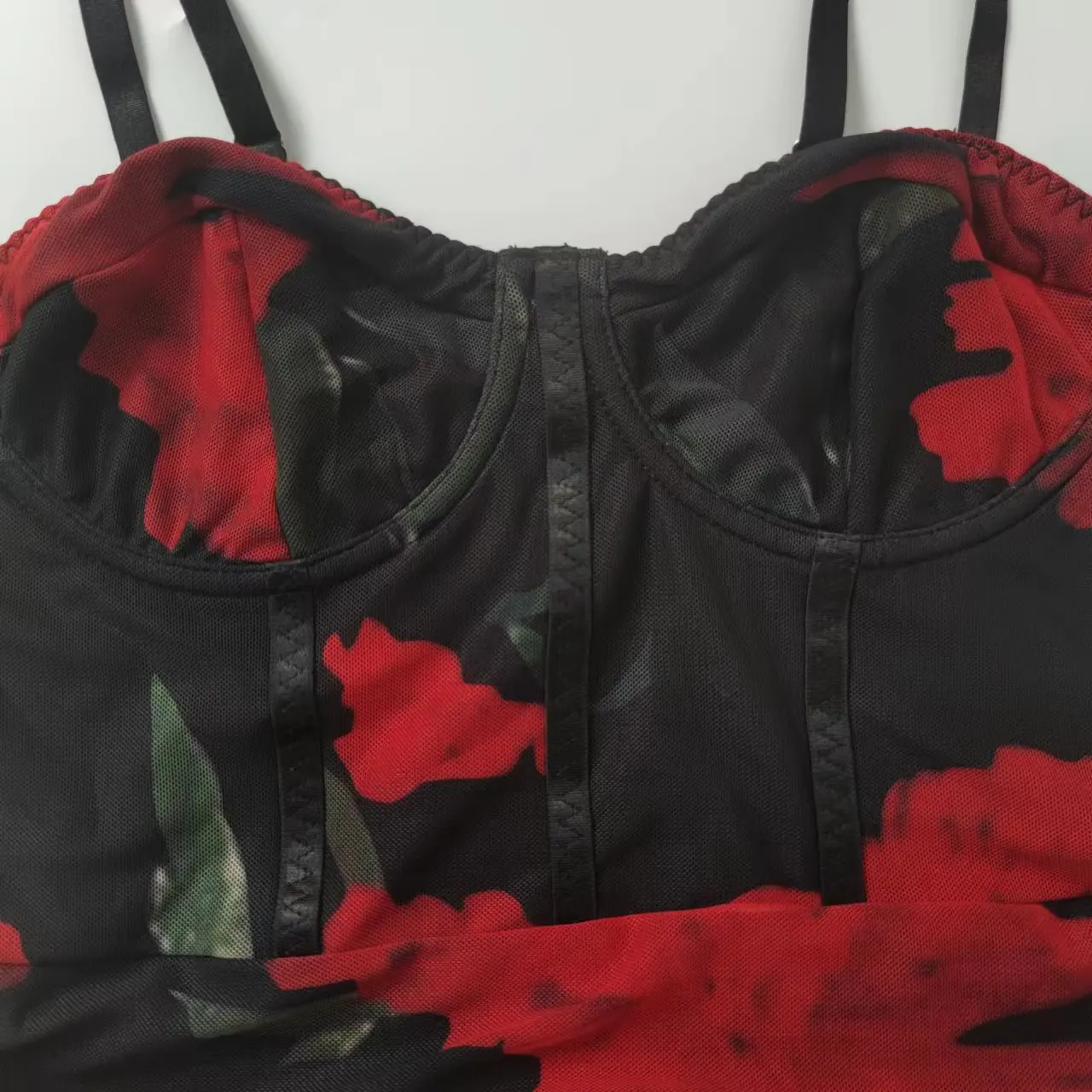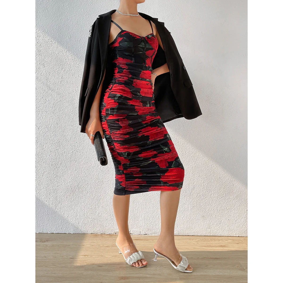 Red Floral Print Tight Fitting Dress Group Dress Women Slim Pleated Wrap Buttocks Long Dress Sexy Backless Spaghetti Strap Dress