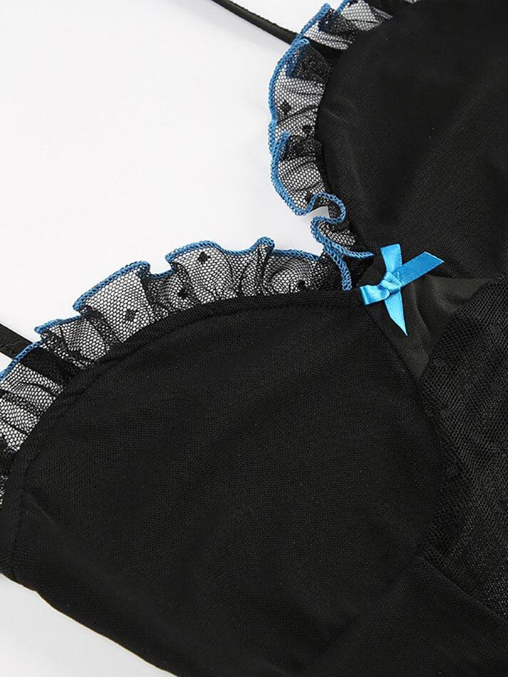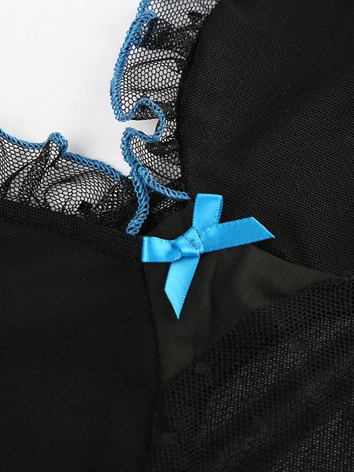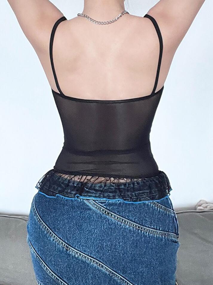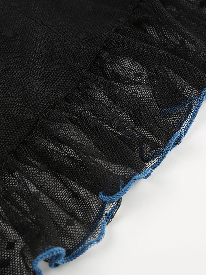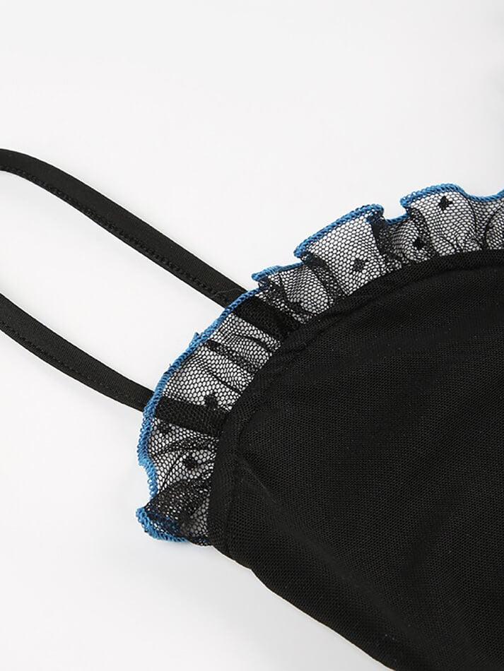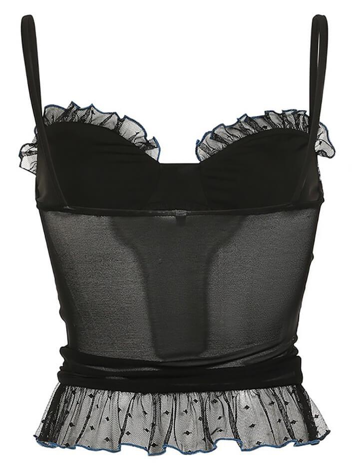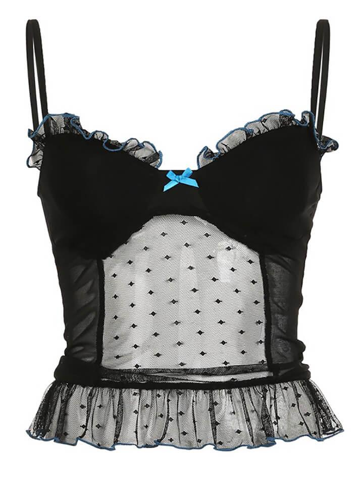Ruffled-Trim Mesh Panel Dotted See-Through Cami Top