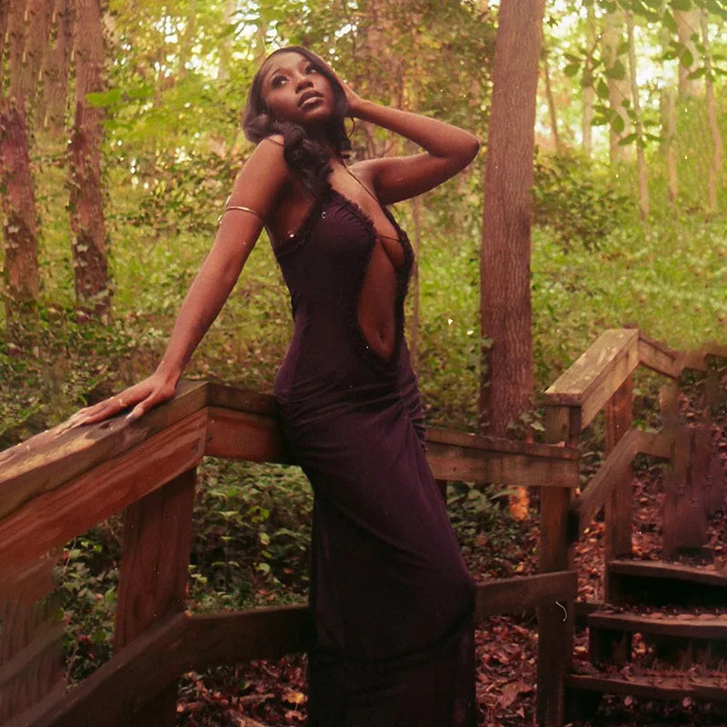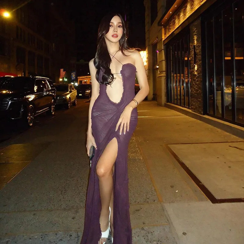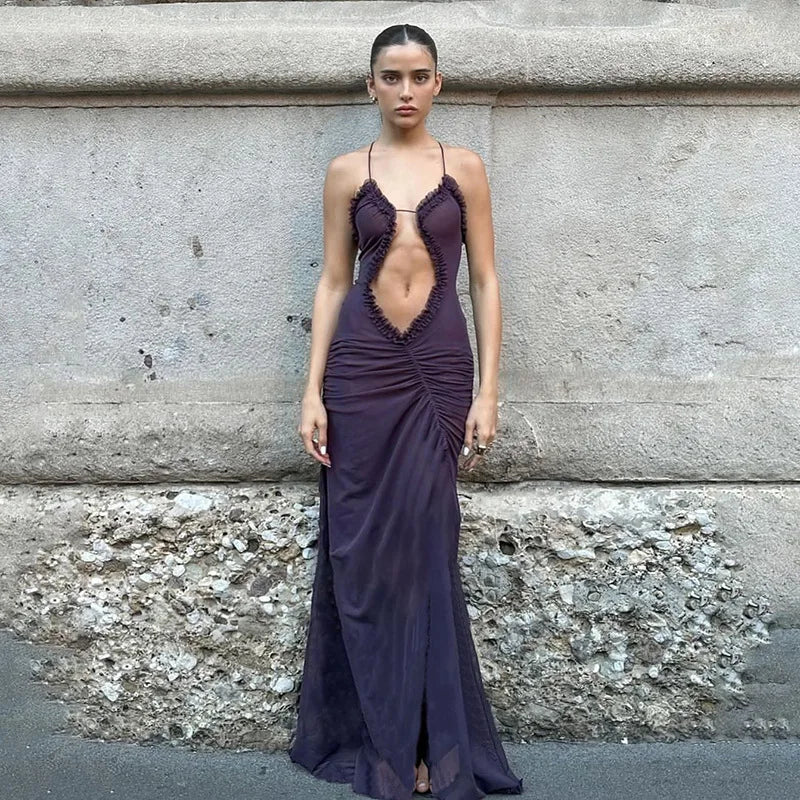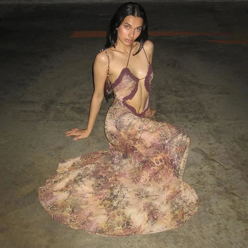 Sexy Hollow Long Dress For Women Print Camisole Off Shoulder Backless Sleeveless Frilly Mixi Dress Female Party