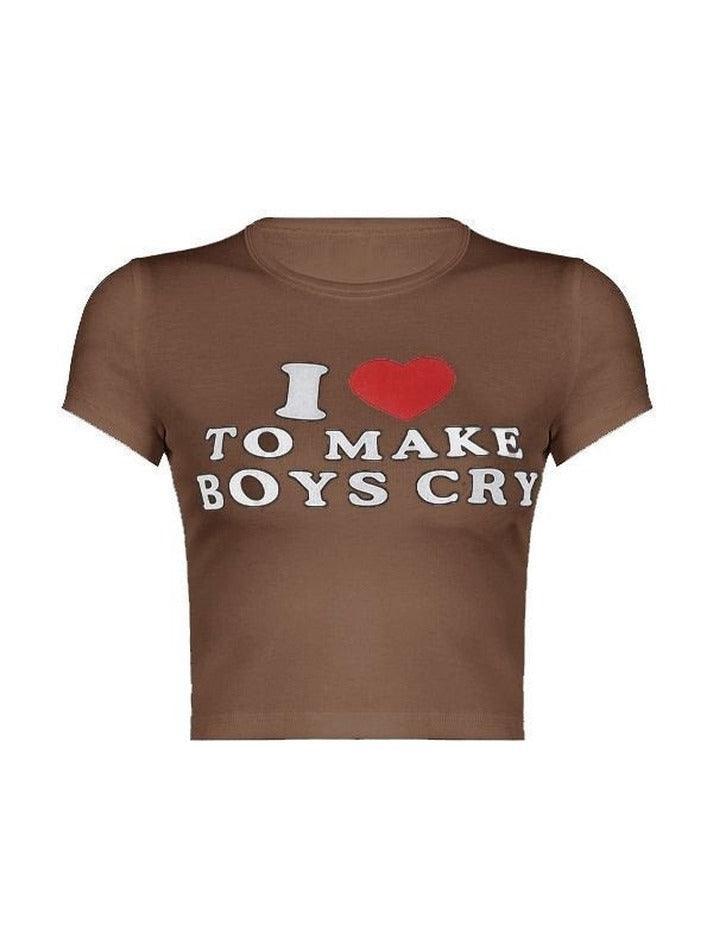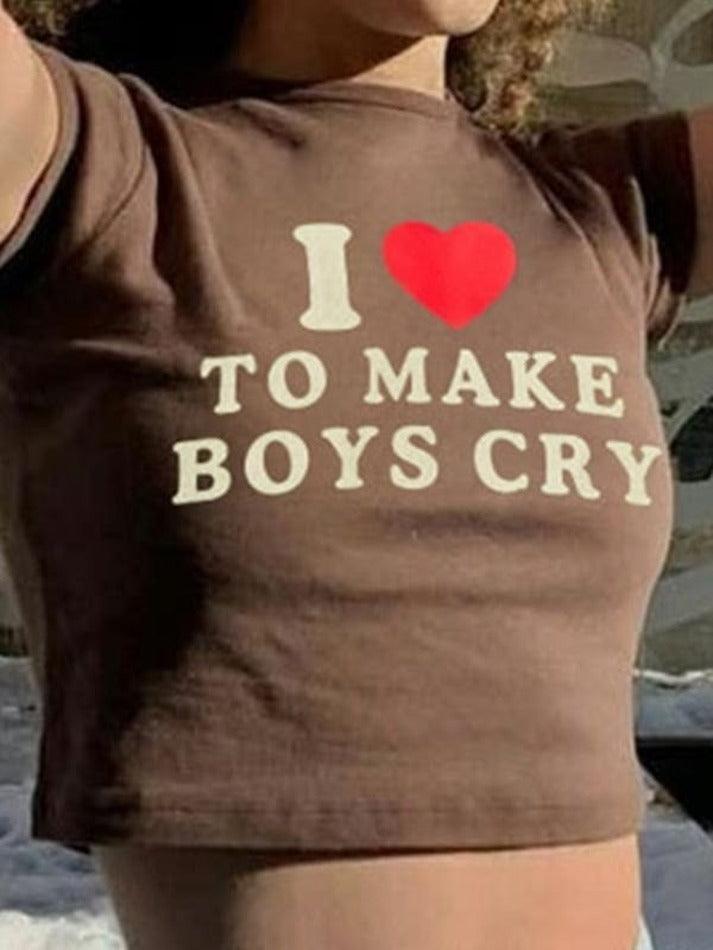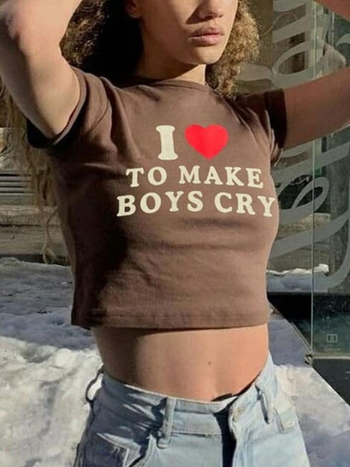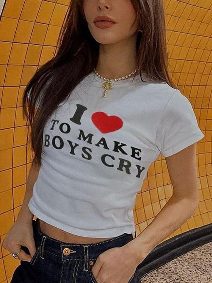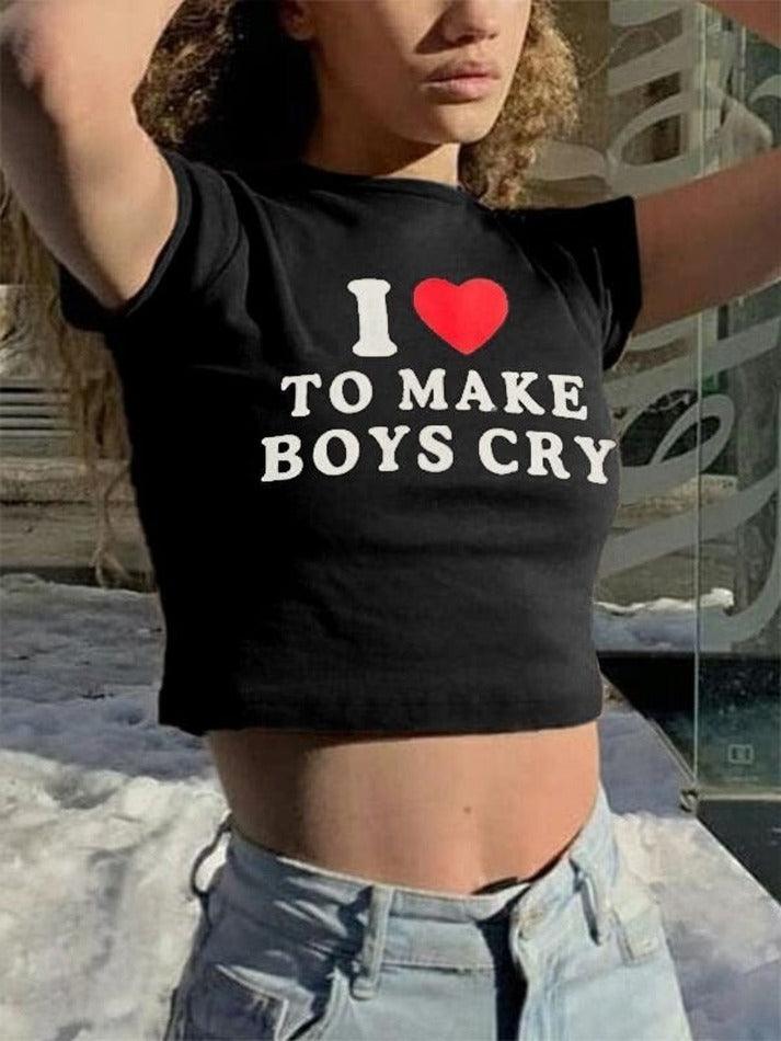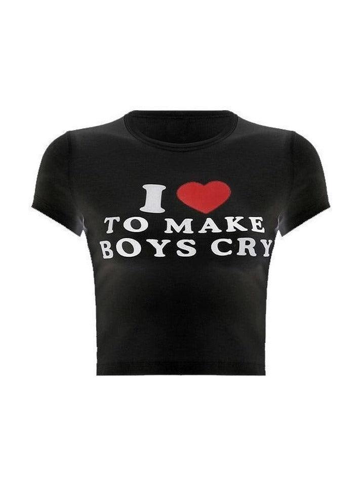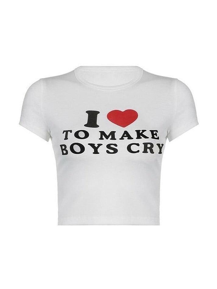 Description: Embrace your trendy side with these stylish short sleeve crop tops. Designed with a slim fit and a fashionable crew neck, these tops are perfect for casual, street, Y2K, and sweet looks. Made from a blend of viscose, polyester, and spandex, they offer a comfortable and flattering fit. Featuring an eye-catching "I love to make boys cry" slogan pattern, these cute tops are sure to make a statement. Get ready to turn heads with this must-have addition to your wardrobe. Get yours now!