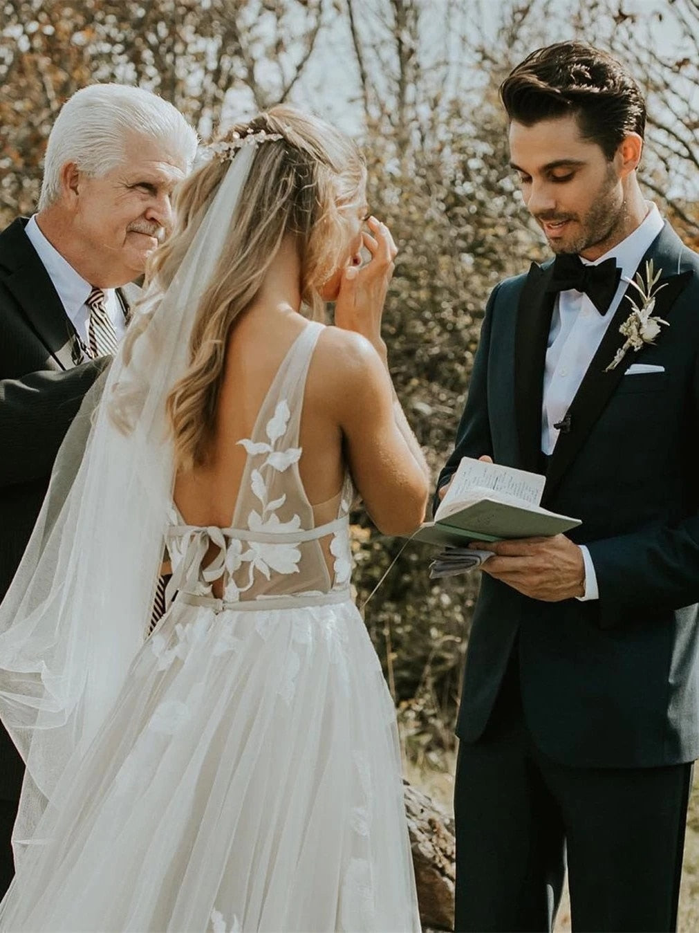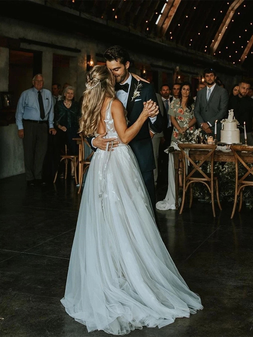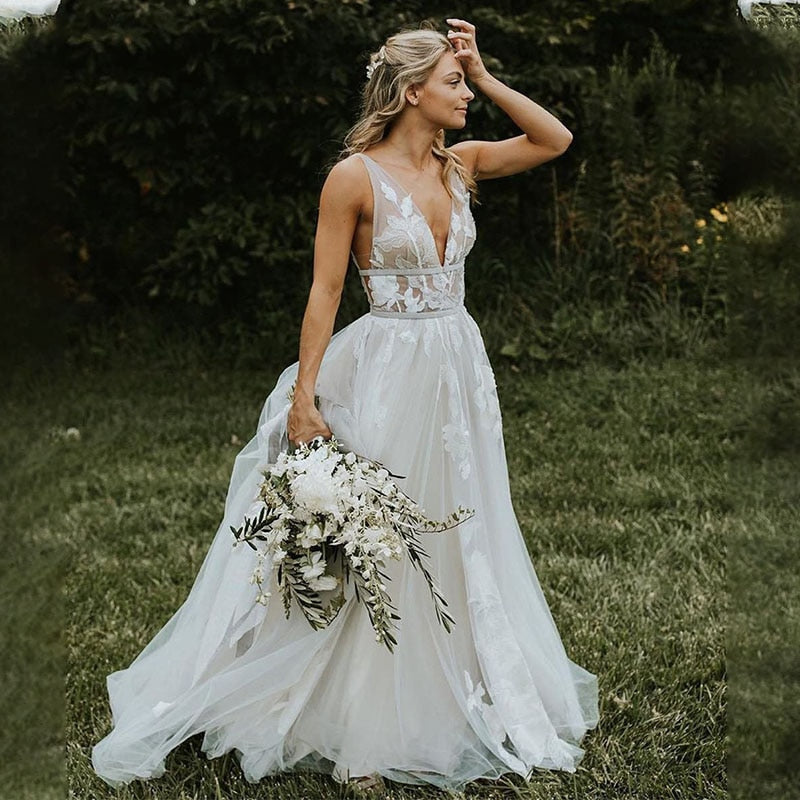 Two Straps V-neck Exposed Boning Grey Tulle Wedding Dress Boho A-line Backless Elegant Floral Appliques Sexy Bridal Dress