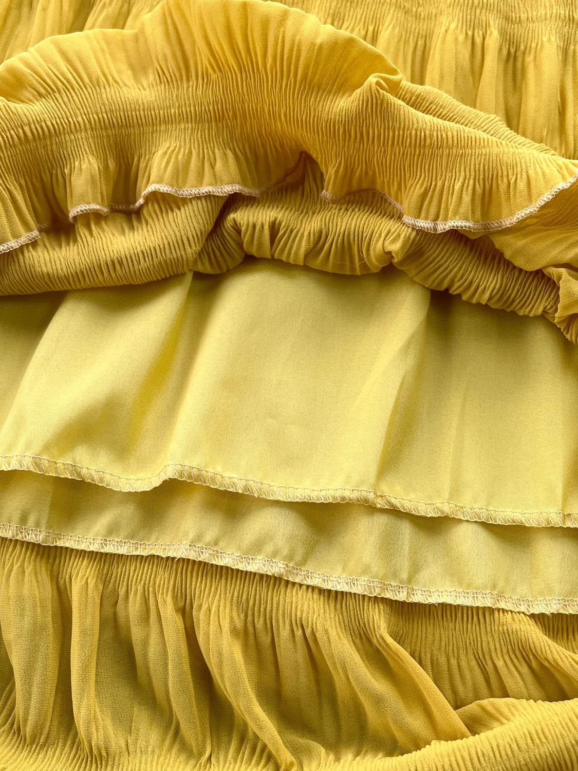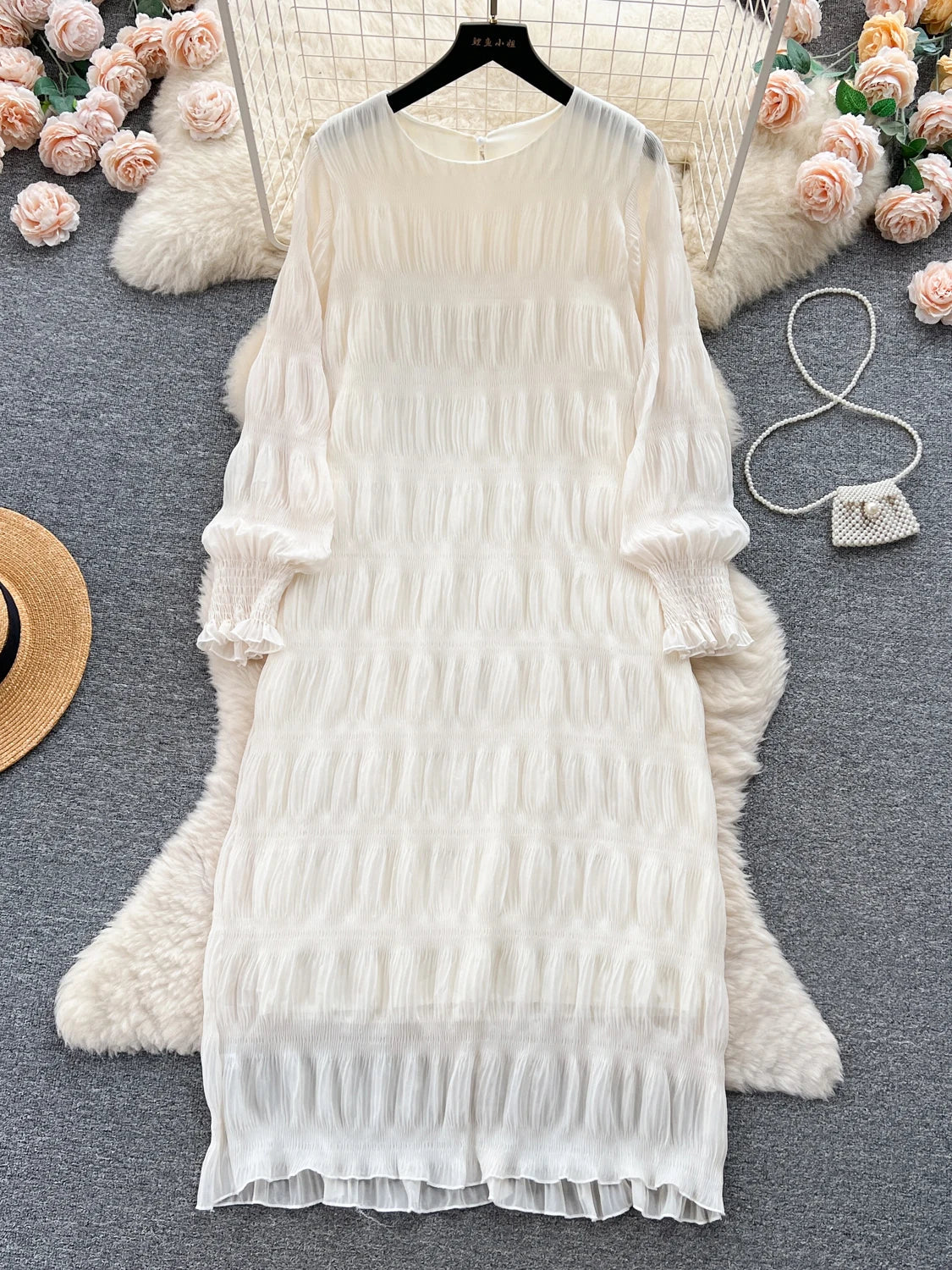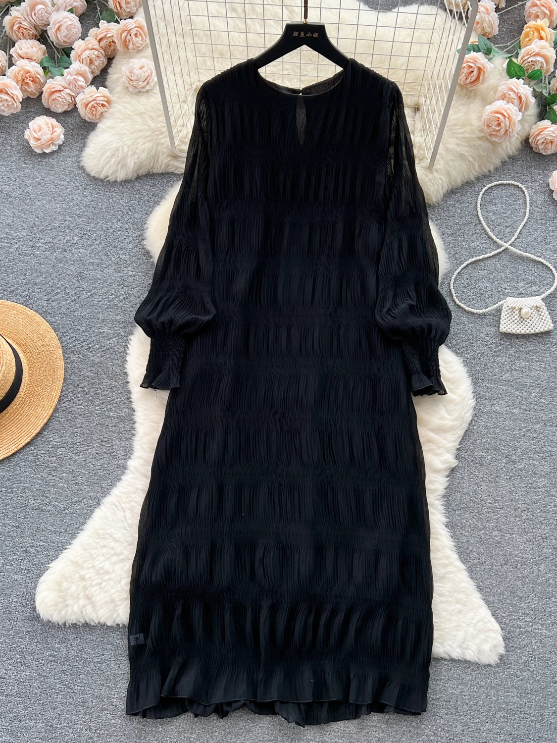 qgtao spring Vintage Women Draped Loose Midi Dress Elegant Round Collar Puff Long Sleeve Robe Casual Yellow/Burgundy/Green Vestido New