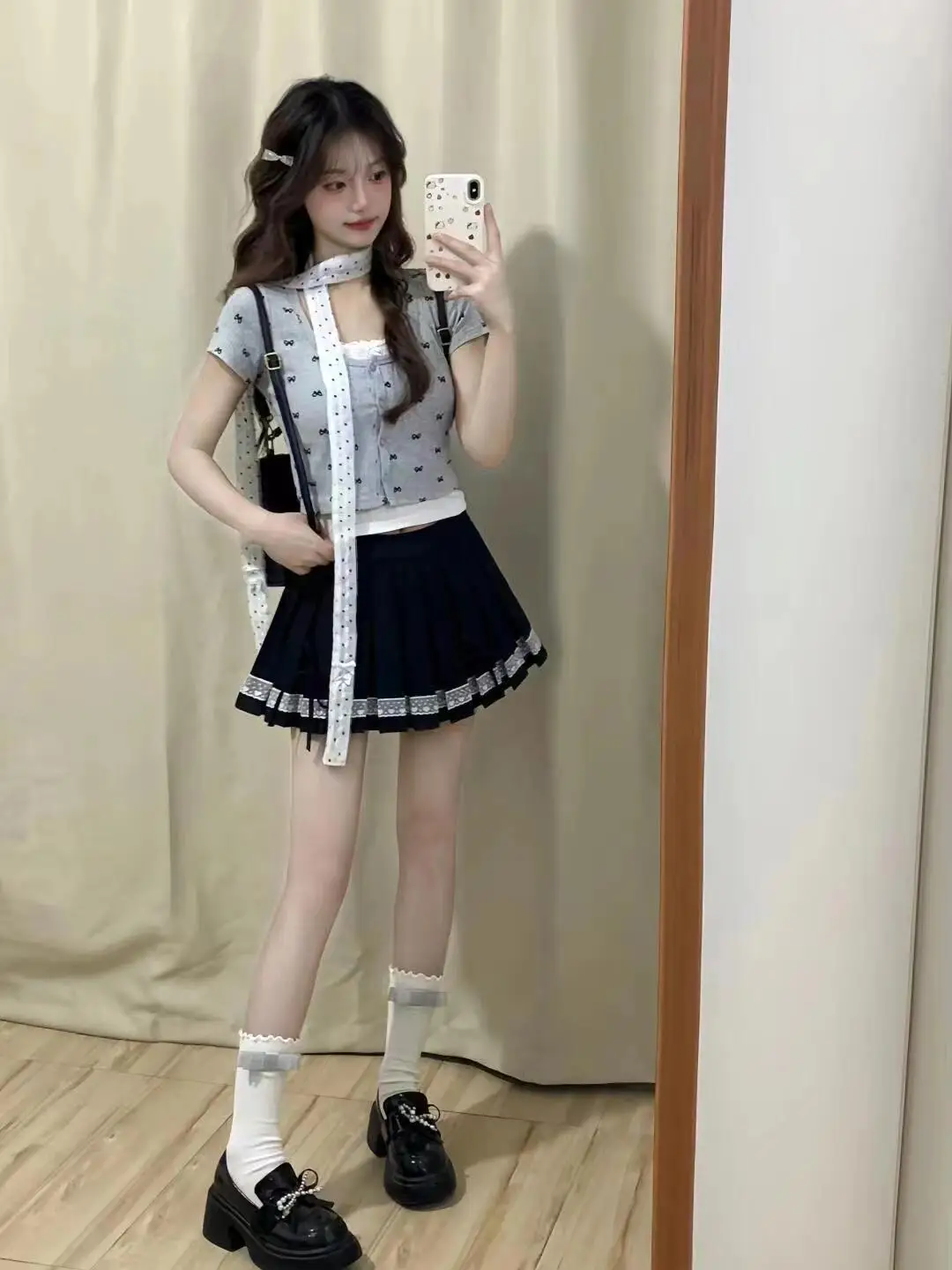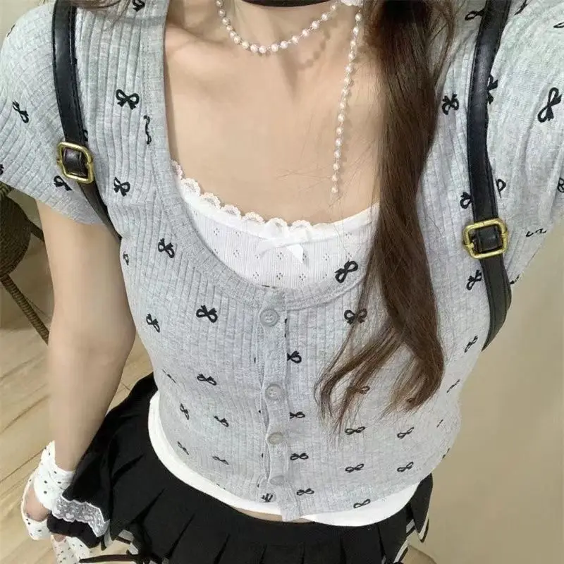 qgtao Y2k Coqutte Buttons Bow Tie Crop Tops O-neck Short Sleeve Shirts Sweet Cardigan 2024 Summer T Shirts.