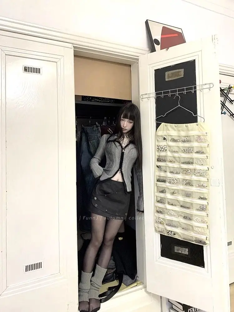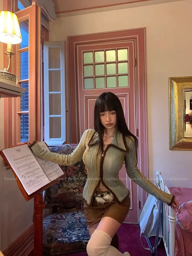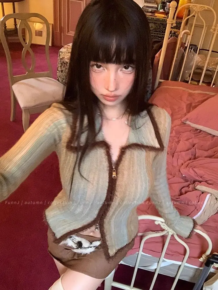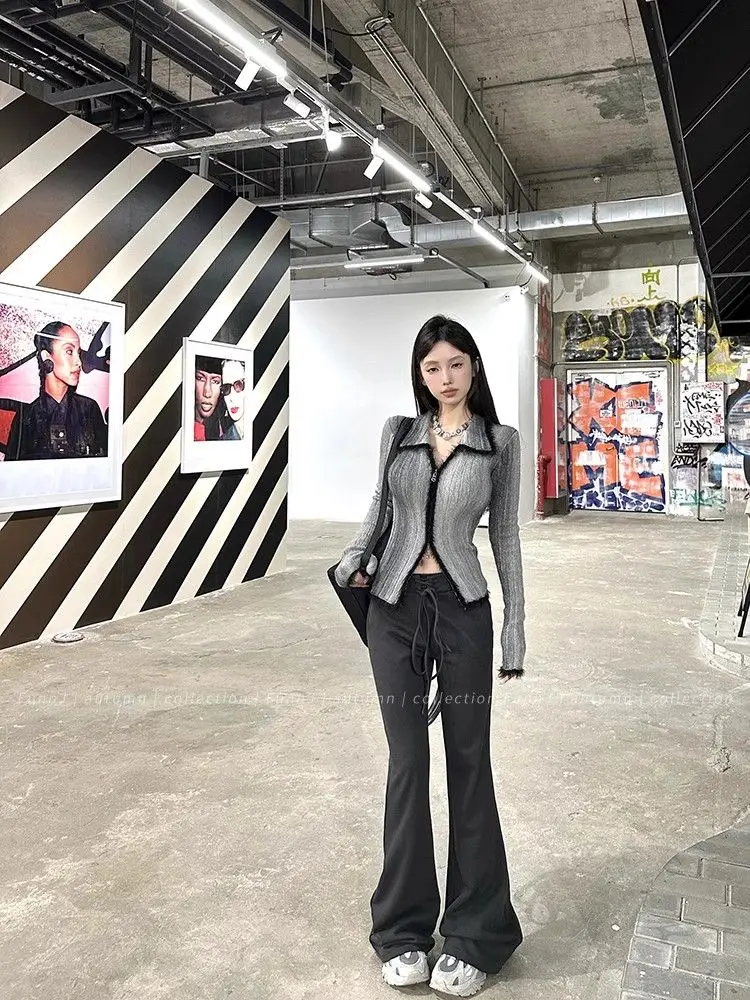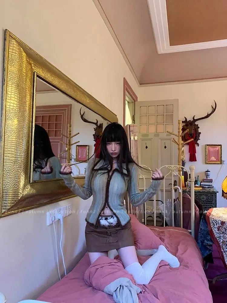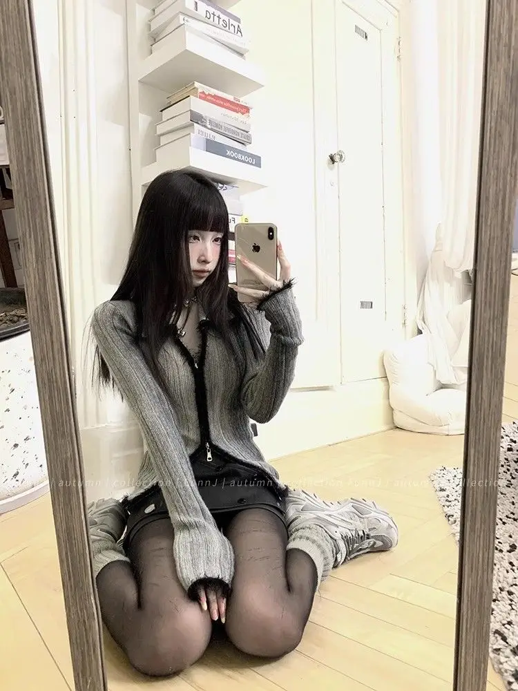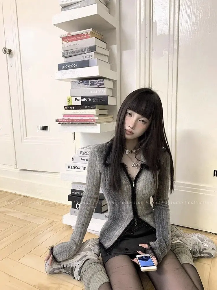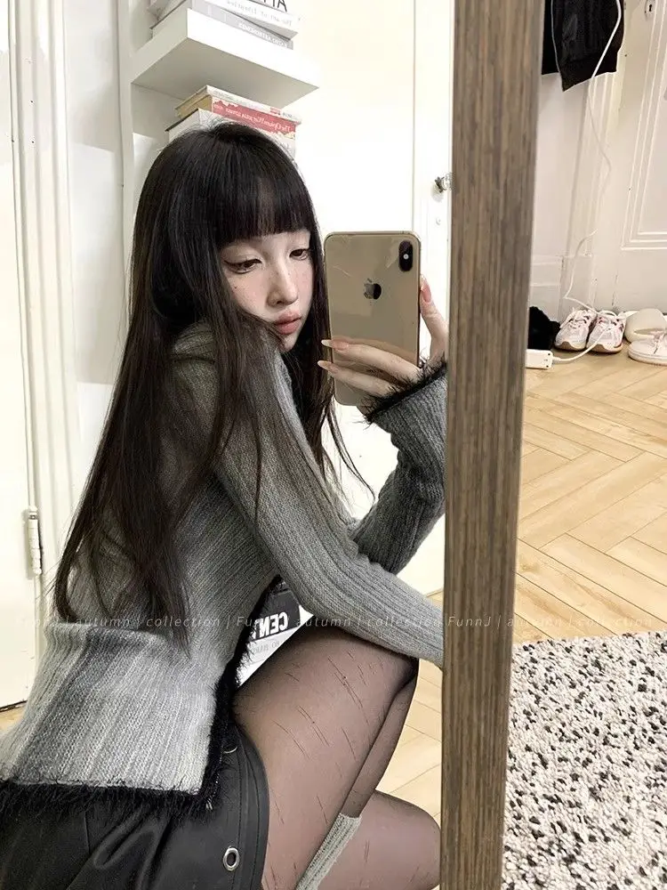 qgtao Y2K Grunge Gray Cropped Cardigan Women Harajuku Vintage Gradient Knitted Sweater Sexy Slim Autumn Winter Jumper 2000s
