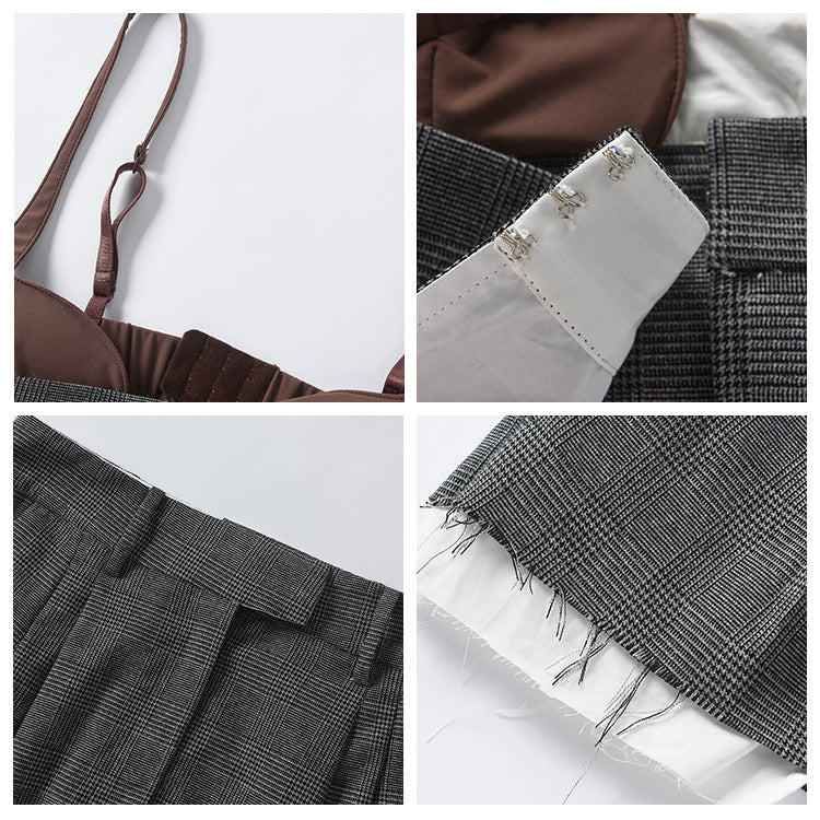 White long-sleeved shirt women's spring clothing new super short Spice Girl suspender outside pleated skirt three-piece set